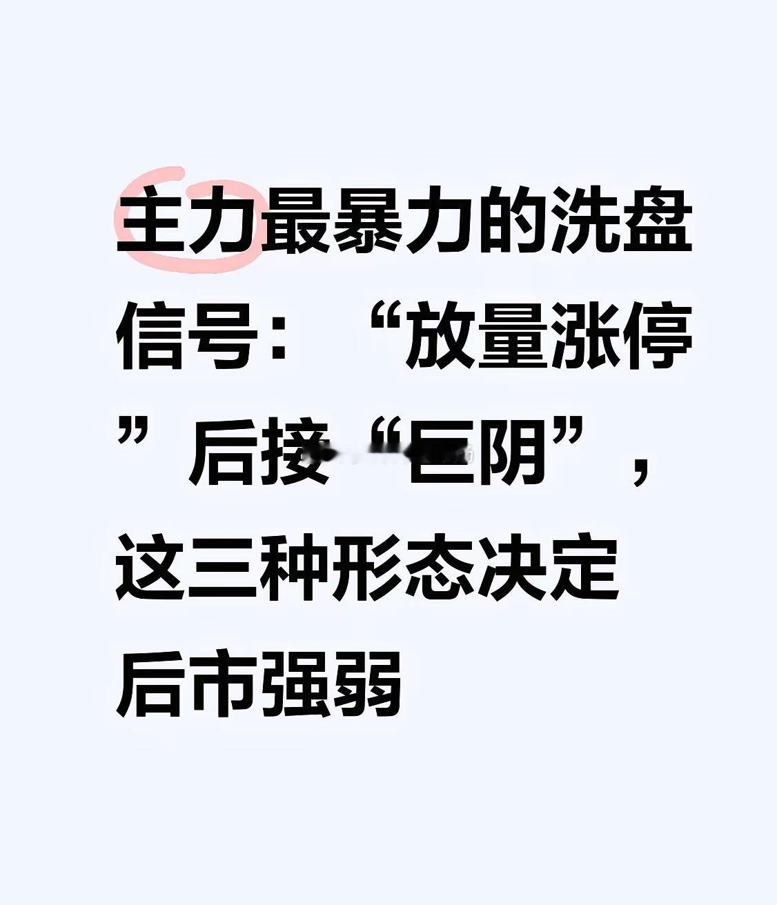一定要注意!在股价启动的主升浪前夕,主力经常会使用一种极端且高效的洗盘手法,就是“前期放量涨停后又巨阴洗盘”。这种组合看似危险,实则是清洗不坚定浮筹、测试下方支撑的经典动作。我们绝不能单纯因为一根大阴线就恐慌离场,看懂其中门道,才能跟上主力节奏。这也是区分强势洗盘与真正出货的核心模型之一。还是老规矩,点赞收藏或评论“主力信号”支持一下,罗洋每天分享实战硬货,以免以后想用的时候找不到了。闲话不多说,直接开讲。我们首先来理解这个组合的核心逻辑:先以放量涨停彰显强势,吸引市场目光;再以巨幅阴线制造恐慌,逼迫短线客和获利盘出局。其后的走势强弱,关键就看巨阴线出现后的股价表现。根据洗盘的深度和力度,主要可以分为三种形态。最强形态——巨阴悬空式洗盘:1. 股价在上升初期或关键平台位,走出一根放量涨停板,成交量明显放大,显示有主力资金强势介入。2. 次日或隔日,股价高开低走或直接低走,收出一根跌幅超过5%、甚至逼近跌停的巨阴线,但收盘价严格保持在涨停阳线的实体上半部分(通常是一半以上),绝不触碰涨停板的开盘价。3. 巨阴当日虽然恐慌,但成交量相比涨停日明显萎缩,说明抛压主要是恐慌盘而非主力大规模出货。随后1-3个交易日内,股价能迅速修复,重新站稳在巨阴线开盘价之上。这种形态表明主力控盘度极高,洗盘手法凌厉但惜售,后市拉升往往最为迅猛。次强形态——巨阴回踩式洗盘:1. 同样先出现一根标志性的放量涨停阳线,确立攻击姿态。2. 随后出现的巨阴线,回调幅度较深,股价通常会跌破涨停阳线的实体中点,但最终收盘会顽强守在涨停阳线的开盘价上方。3. 巨阴线之后,股价进入3-7个交易日的缩量整理阶段,小阴小阳交错,但股价重心不再下移,始终以涨停阳线的开盘价作为铁底进行震荡。这个阶段,成交量会持续萎缩至地量水平。这种形态洗盘更为充分,通过回踩涨停启动位来夯实基础,常见于主升浪的中途换档,后续走势稳健而持久。常见但需警惕的形态——巨阴探底式洗盘(假破位):1. 股价放出涨停后,跟随的巨阴线下跌动能猛烈,盘中最低价甚至击穿了涨停阳线的最低价(即开盘价),形成技术上的“破位”假象。2. 然而,股价在破位后能够被迅速拉回,收盘时仍努力收在关键价区附近。或者,在后续1-2日内能马上阳线反包,快速收复破位失地。3. 整个过程中,成交量变化不规则,巨阴当日可能放量,但反弹时也能放量,显示多空博弈激烈。主力借此进行深度且剧烈的震荡,旨在最大限度地清洗筹码。这种形态是主力的“假摔”动作,意在制造技术破位的恐慌,洗盘效果最强,但也最考验持股者的心态。识别关键在于破位后能否被迅速、有力地修复。这就是“放量涨停后又巨阴洗盘”的三种主要形态了!不过,无论哪种形态,其前提都是处于股价的上升趋势或长期横盘突破的边缘,均线系统整体保持多头排列。值得注意的是,巨阴线出现后的修复时间至关重要,若超过7-10个交易日仍无法有效企稳反弹,则需要警惕演变为真正出货的风险。切记。好了!如果复盘时,还有朋友对今天的内容有任何疑问,欢迎在下方留言。如果这个分享对你识别主力意图有所帮助,记得转发给身边的朋友,关注罗洋,带你洞察资金背后的真实逻辑。