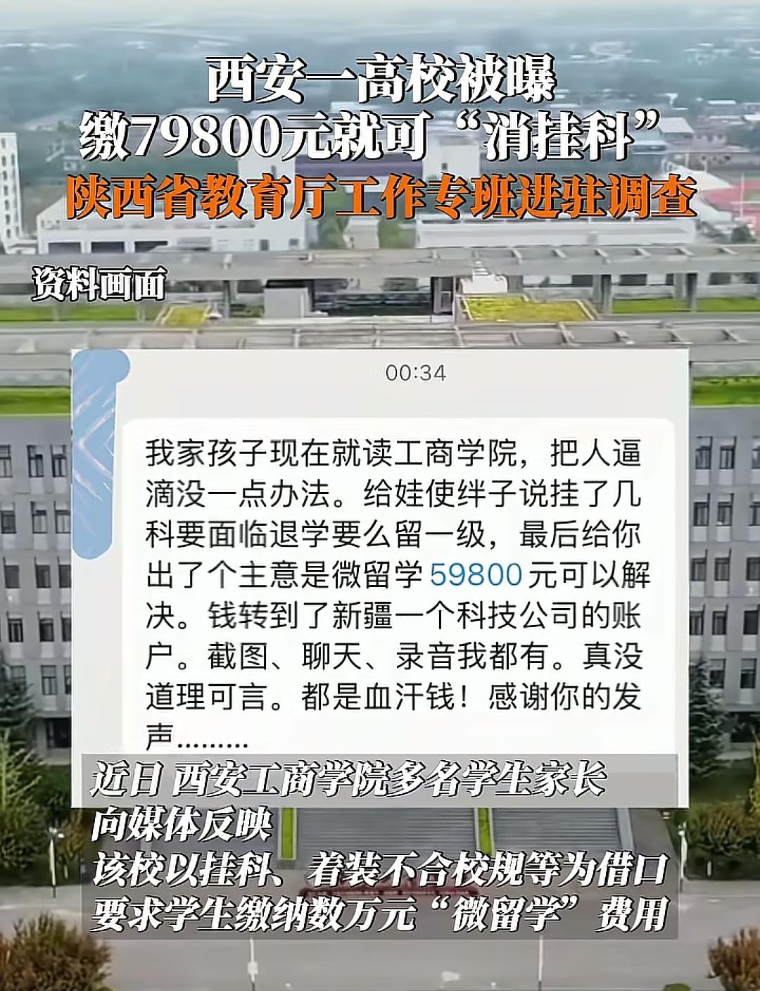 离谱!缴79800元就能消挂科?这大学把家长当成提款机了。西安工商学院这波操作,真的刷新三观,大二家长邬女士哭诉,孩子因为宿舍纪律差、4门课加军训挂科,辅导员直接放话,要么交钱,要么留级退学! 交的啥钱?79800元的“微留学”费!更恶心的是,老师还暗示,交了钱评奖评优、助学金都能优先照顾! 结果钱交了,留学行程连影子都没有,就只给孩子换了个宿舍! 大四家长黄女士更惨,同样因挂科被逼缴费,辅导员干脆摊牌:这项目就是给挂科生设的,压根没留学! 最扯的是,钱没进学校对公账户,全转到了一家异地无纳税记录的科技公司,发票更是连影子都见不到! 更让人愤怒的是,这根本不是个别辅导员的事,是学校层面的系统性敛财! 校方专门培训老师用“攻心策略”,教他们拿捏家长“怕孩子毕不了业”的心理,还强调要“掌握说话的艺术”。更把报名数和教师绩效绑定,拉来人头有奖励,拉不到就扣钱,教职工群里还天天发“喜报”炫耀! 办学质量跟不上,生源没竞争力,就盯着家长的血汗钱下手? 把挂科当筹码,把学生当摇钱树,把教育做成了一门敲诈勒索的生意! 这哪里是大学?分明是披着高校外衣的敛财窝点! 公平的学业评价体系,被“有钱能使鬼推磨”踩在脚下。家长的焦虑被当成商机,学生的未来被当成商品! 好在教育厅已经派专班进驻调查,希望能一查到底:退钱!追责!揪出背后的利益链!教育的底线是育人,不是捞钱!这种黑心操作,必须狠狠整治!