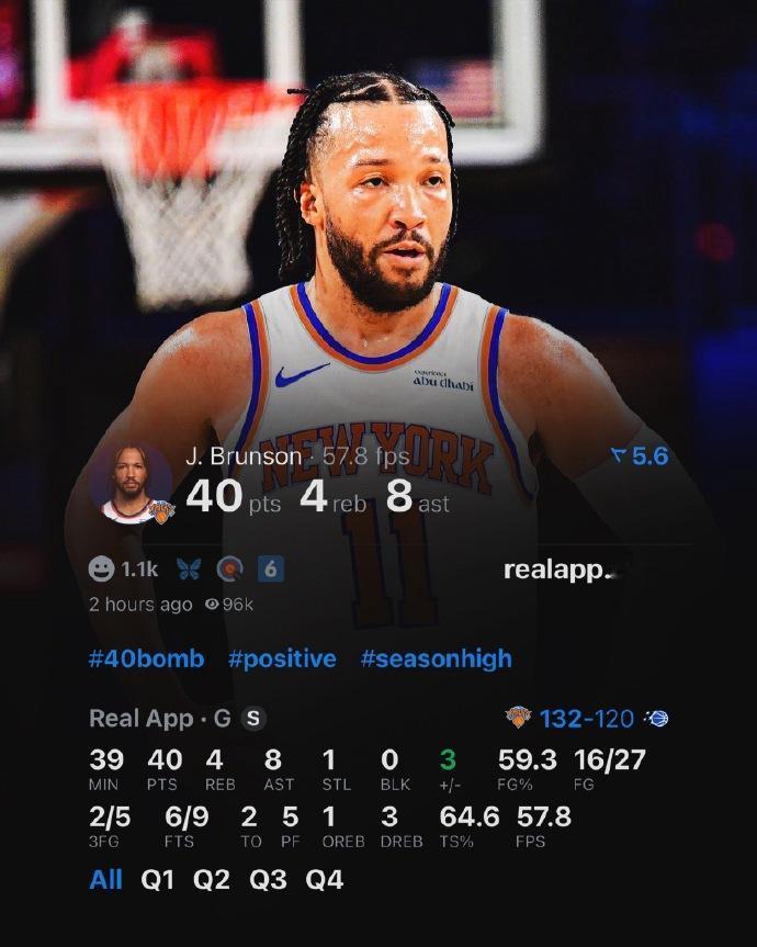 布伦森真的太强了! NBA杯半决赛,布伦森出战38分38秒,27投16中,拿下40分4板8助攻,尼克斯132-120击败魔术,打进NBA杯决赛。 目前这支尼克斯,显然和雷霆的攻防能力还有差距,但布伦森是个异类,大头仿佛天生为大场面而生,越是关键比赛,越是状态上扬。 NBA杯决赛,不管尼克斯是面对雷霆还是马刺,对手都不可能在这种一战定胜负的比赛里确保胜利,NBA是创造奇迹的地方,万一大头在决赛场上站出来来一个“zone”模式,那全员雷霆也顶不住....