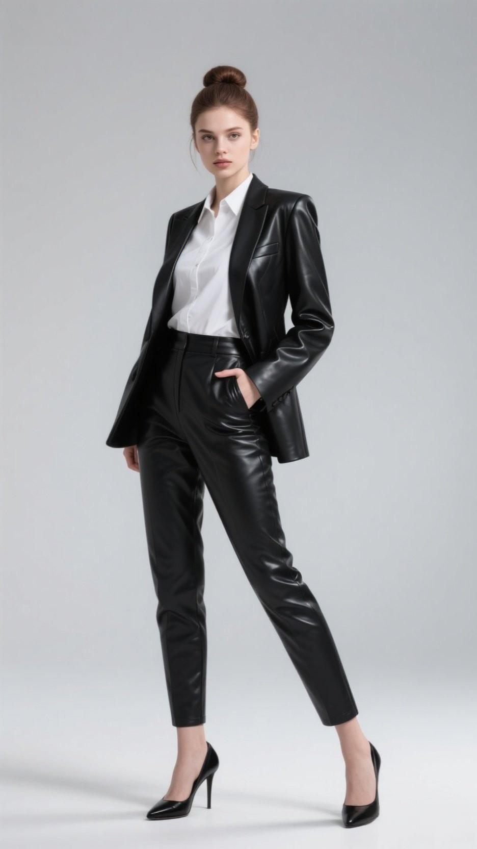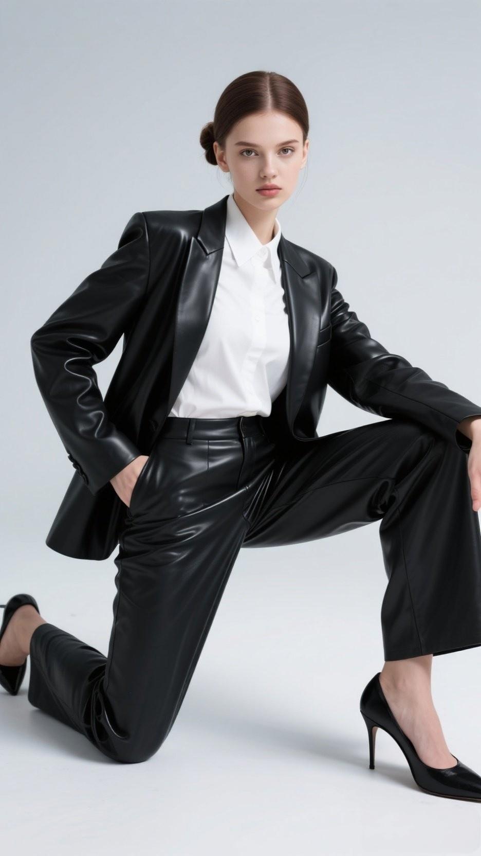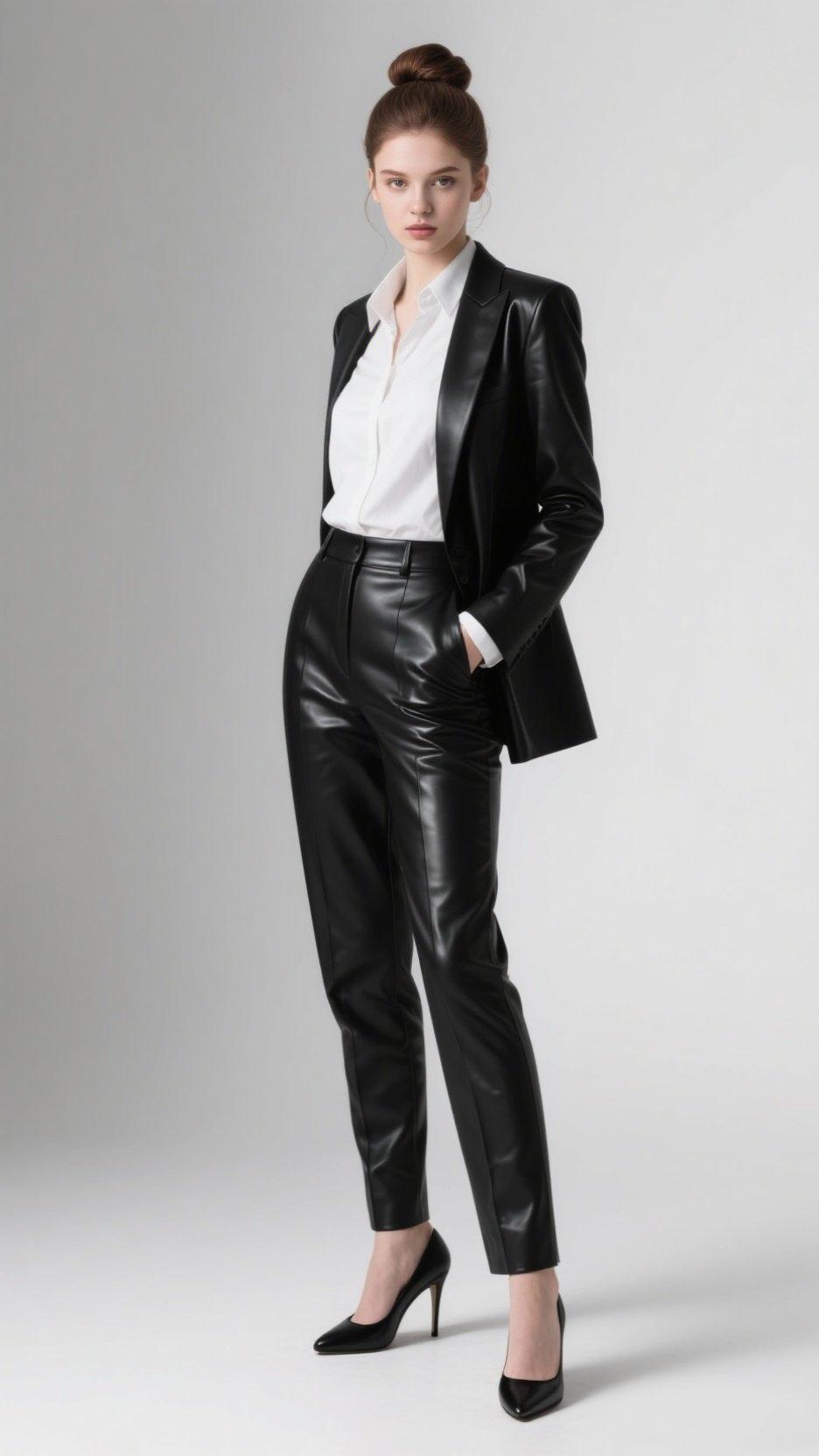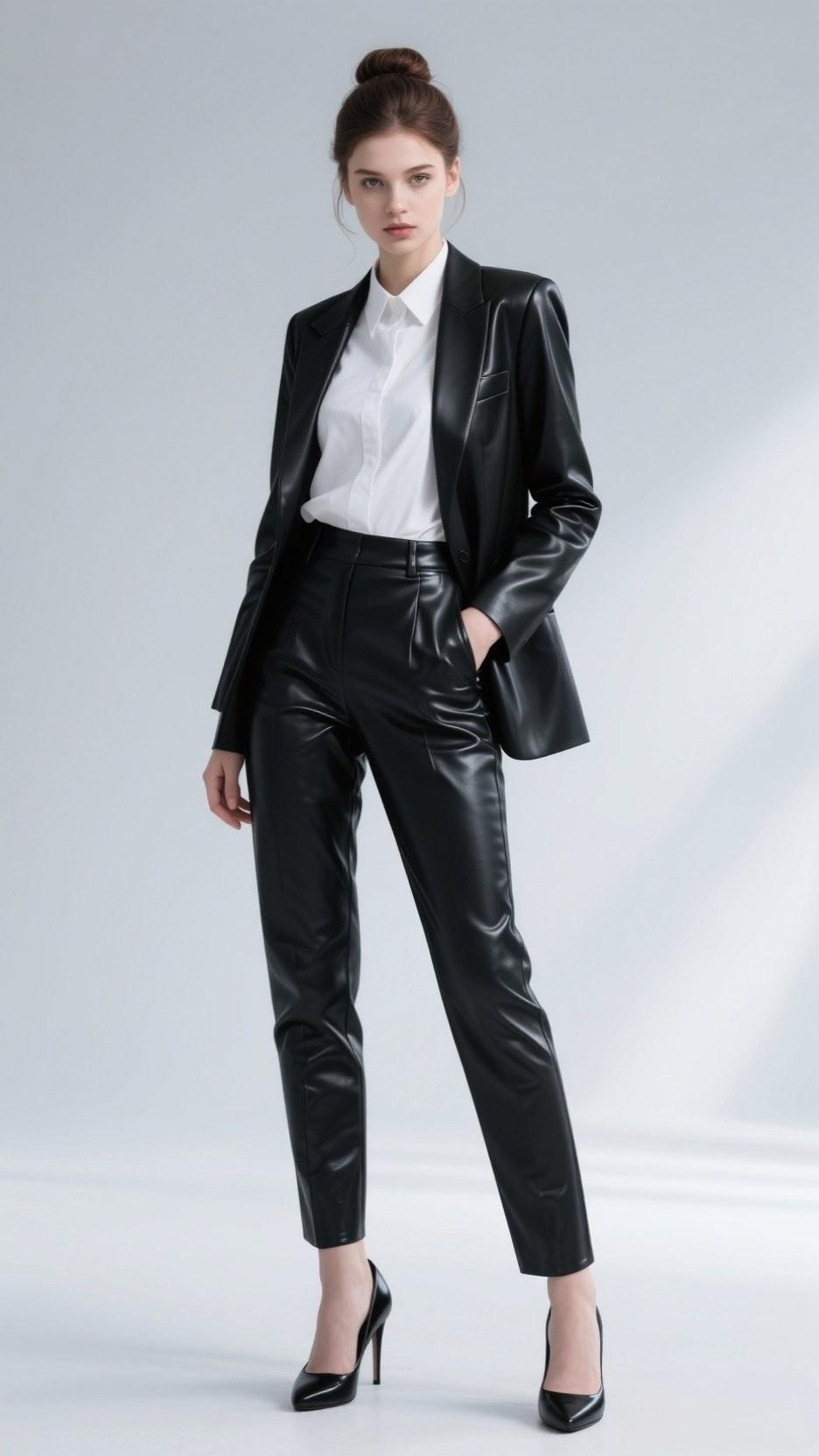 优雅职场风,黑色皮衣搭配白衬衫,尽显干练气质!