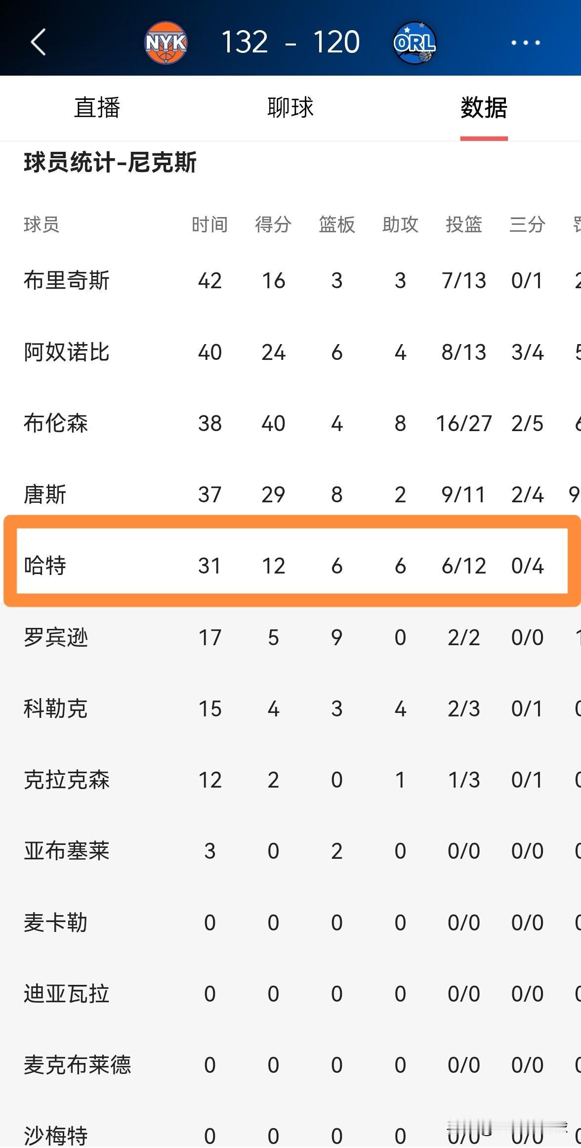 尼克斯大将哈特真是太拼了!在今天尼克斯以132:120战胜魔术的NBA杯半决赛中,哈特在攻防两端都拼尽全力,他在首发出战的31分钟里,投篮12中6得到12分6篮板6助攻3抢断。 值得一提的是,本场比赛哈特最终拼到六犯离场,可以说为了能够帮助球队获胜,哈特真是倾其所有了。