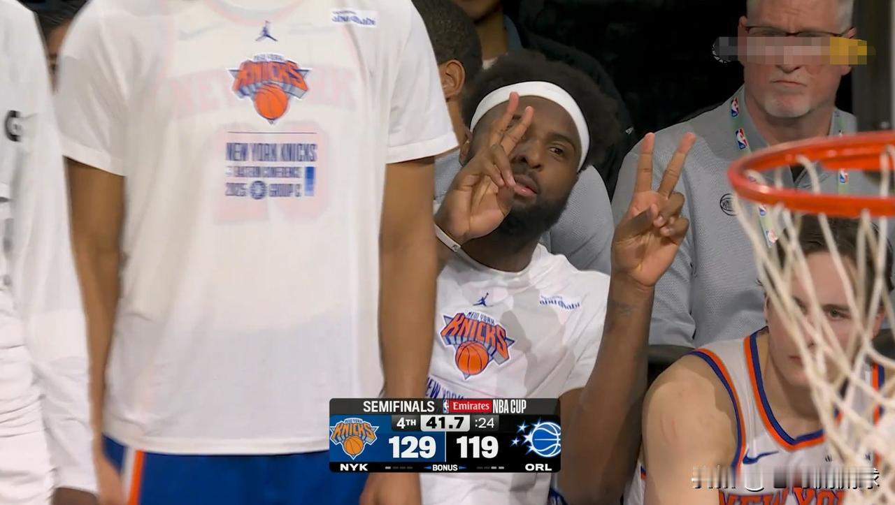尼克斯大将罗宾逊真是开心坏了!在今天进行的尼克斯和魔术的NBA杯半决赛中,当时比赛进行到了第四节的最后时刻,尼克斯以129:119领先对手,基本上胜局已定了。当转播镜头给到尼克斯的替补席时,只见此役得到5分9篮板的罗宾逊心情大好,他非常开心的对着镜头比“✌✌”,此时此刻罗宾逊开心的像个孩子。