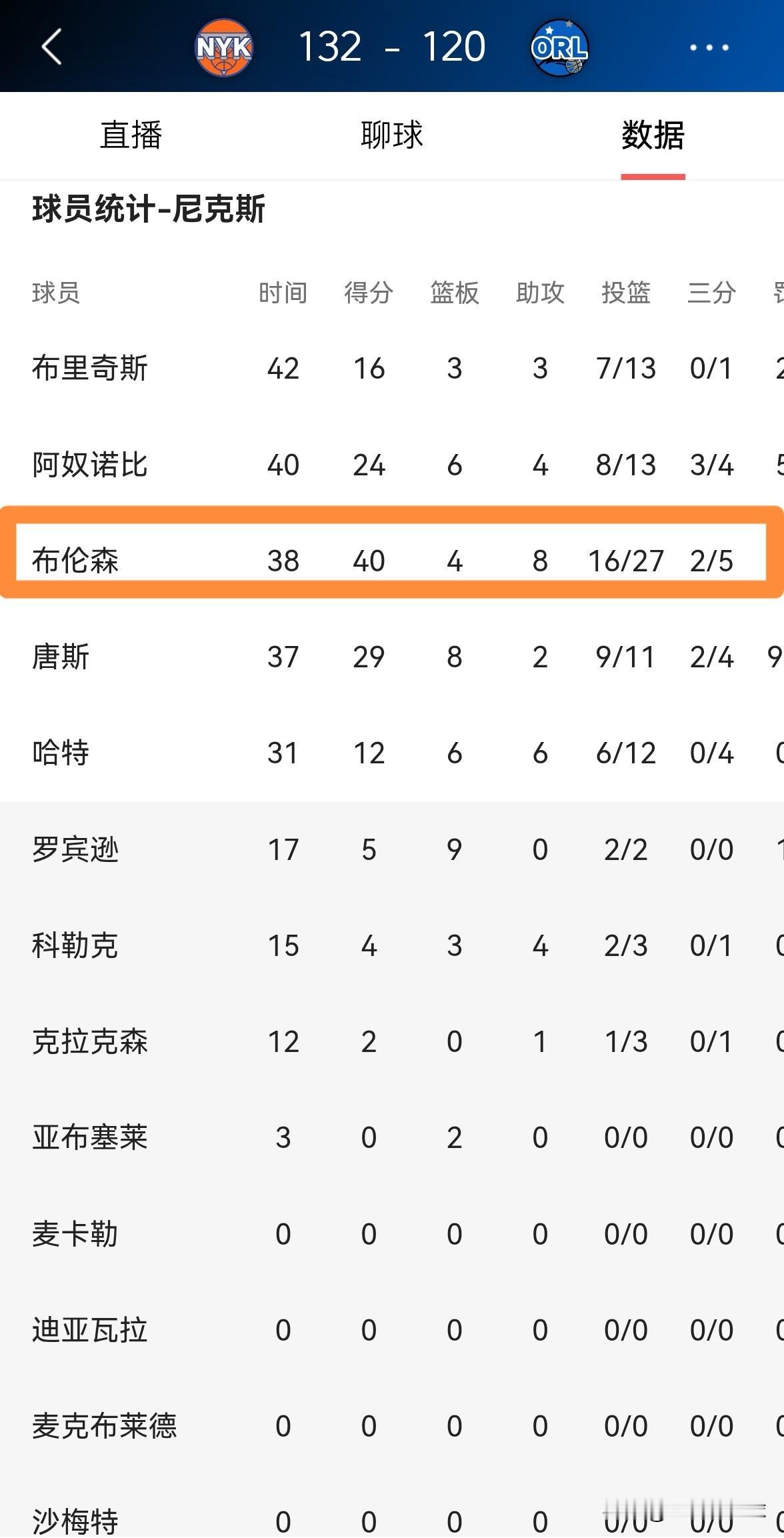 尼克斯当家球星布伦森真是太能得分了!今天尼克斯在NBA杯半决赛中以132:120力克魔术,成功晋级决赛。值得注意的是,本场比赛布伦森展现出了超强的得分能力,他在首发出战的38分钟里,投篮27中16,其中三分球5中2、罚球9中6爆砍40分4篮板8助攻1抢断。 毫不夸张的说,以布伦森目前的得分能力来看,他已经跻身NBA超级得分手行列。
