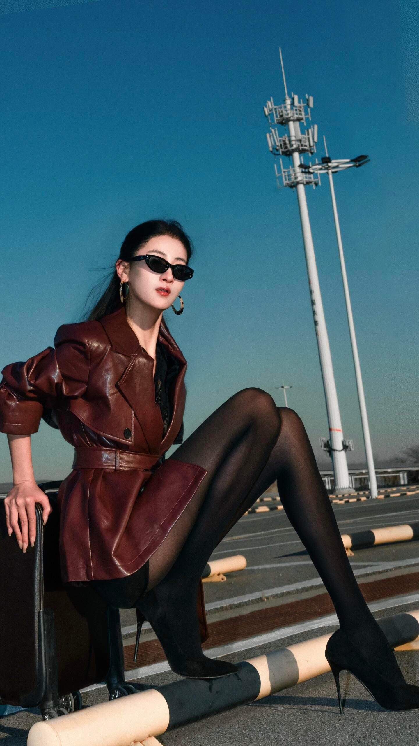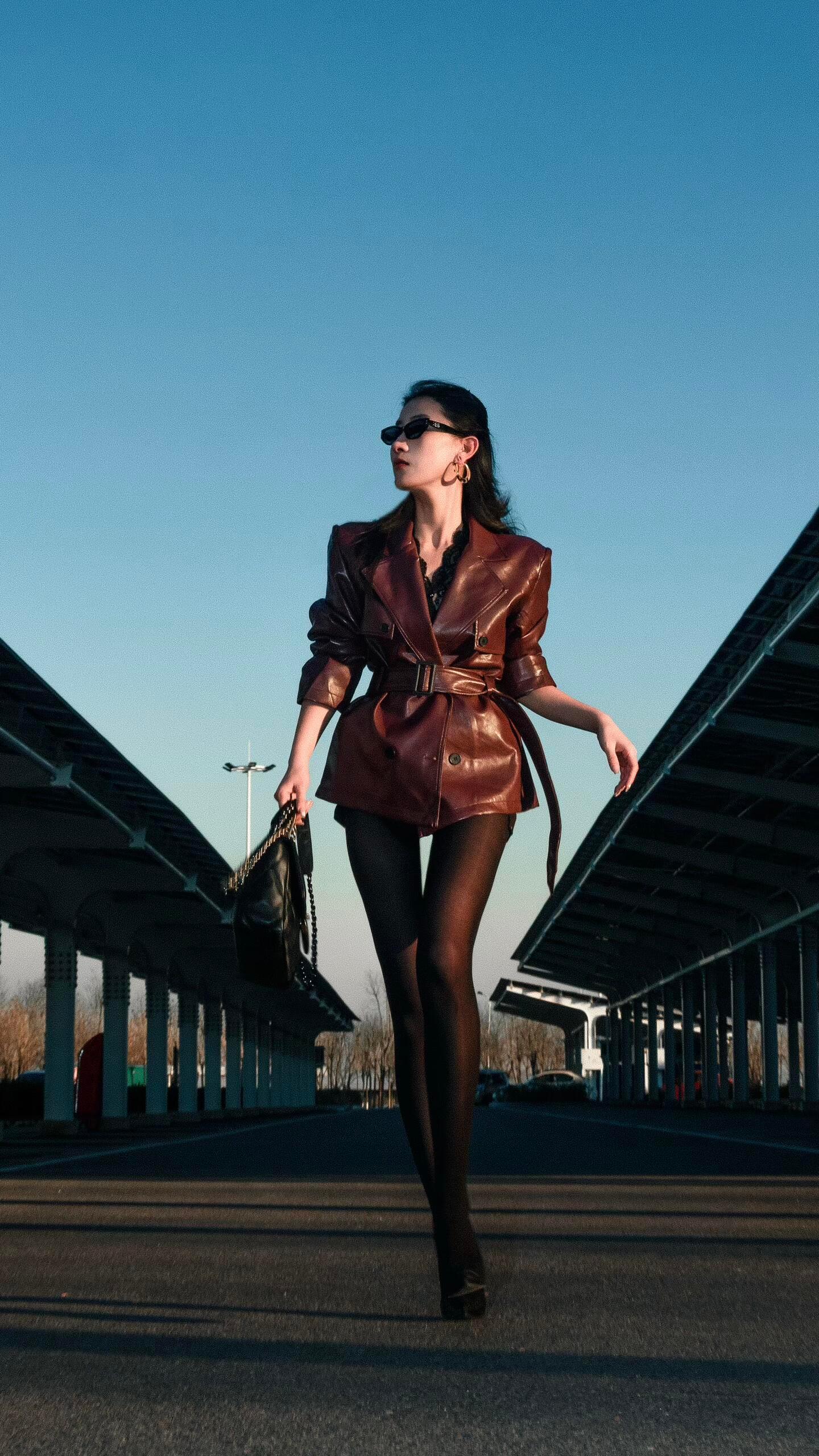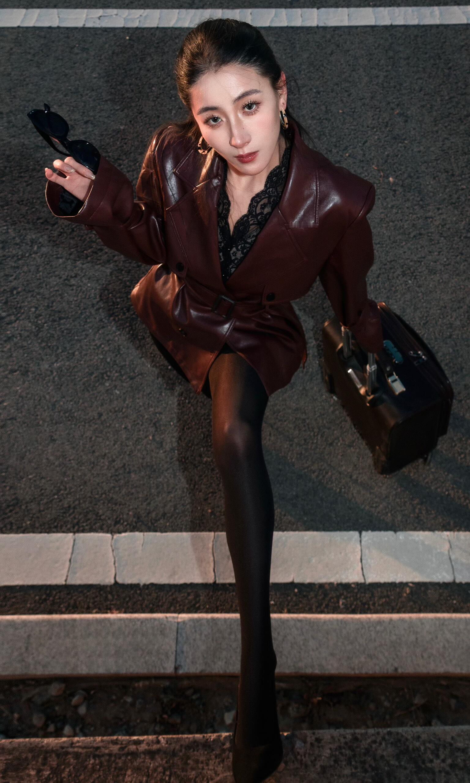 红皮衣当然要配厚黑啦,上松下紧的穿搭总是不会出错,内搭黑色蕾丝打底衫是我的小心机~再搭配一副墨镜气场直接拉满!