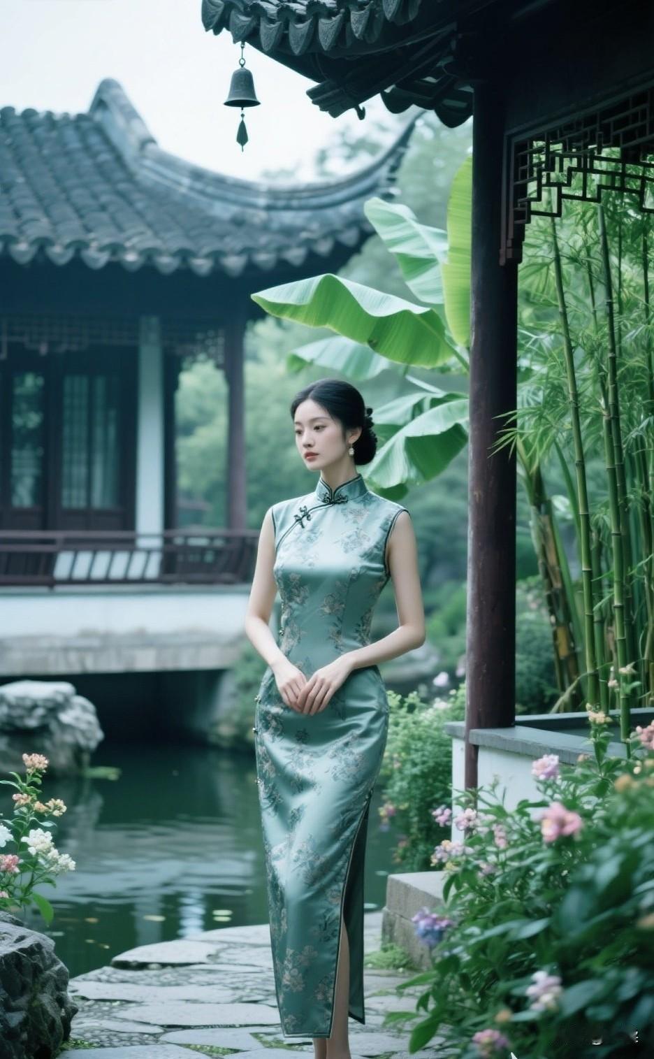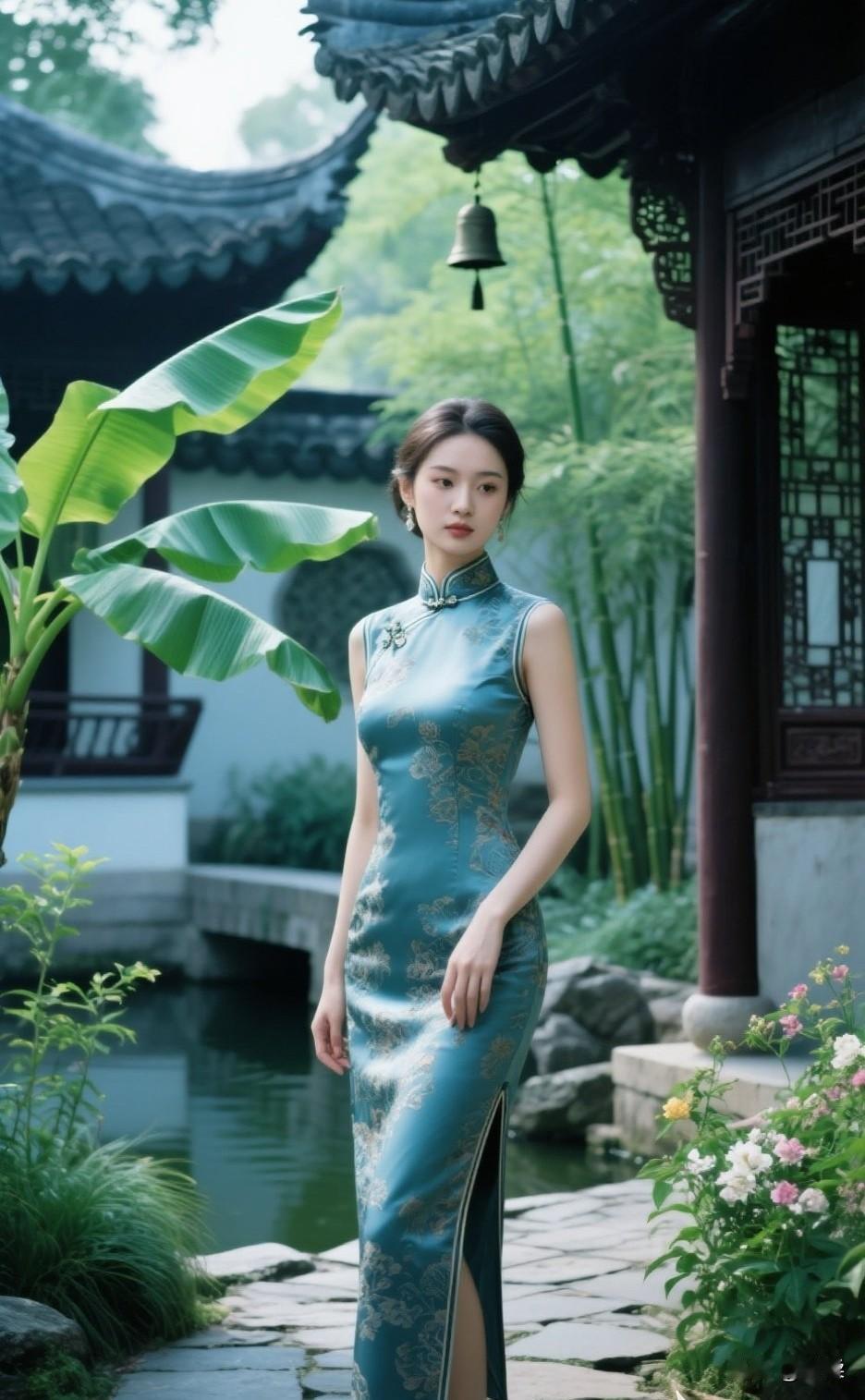 太美了!她穿着旗袍在森林里赏花江南美女旗袍 旗袍风景 绿花旗袍少女 户外景点旗袍