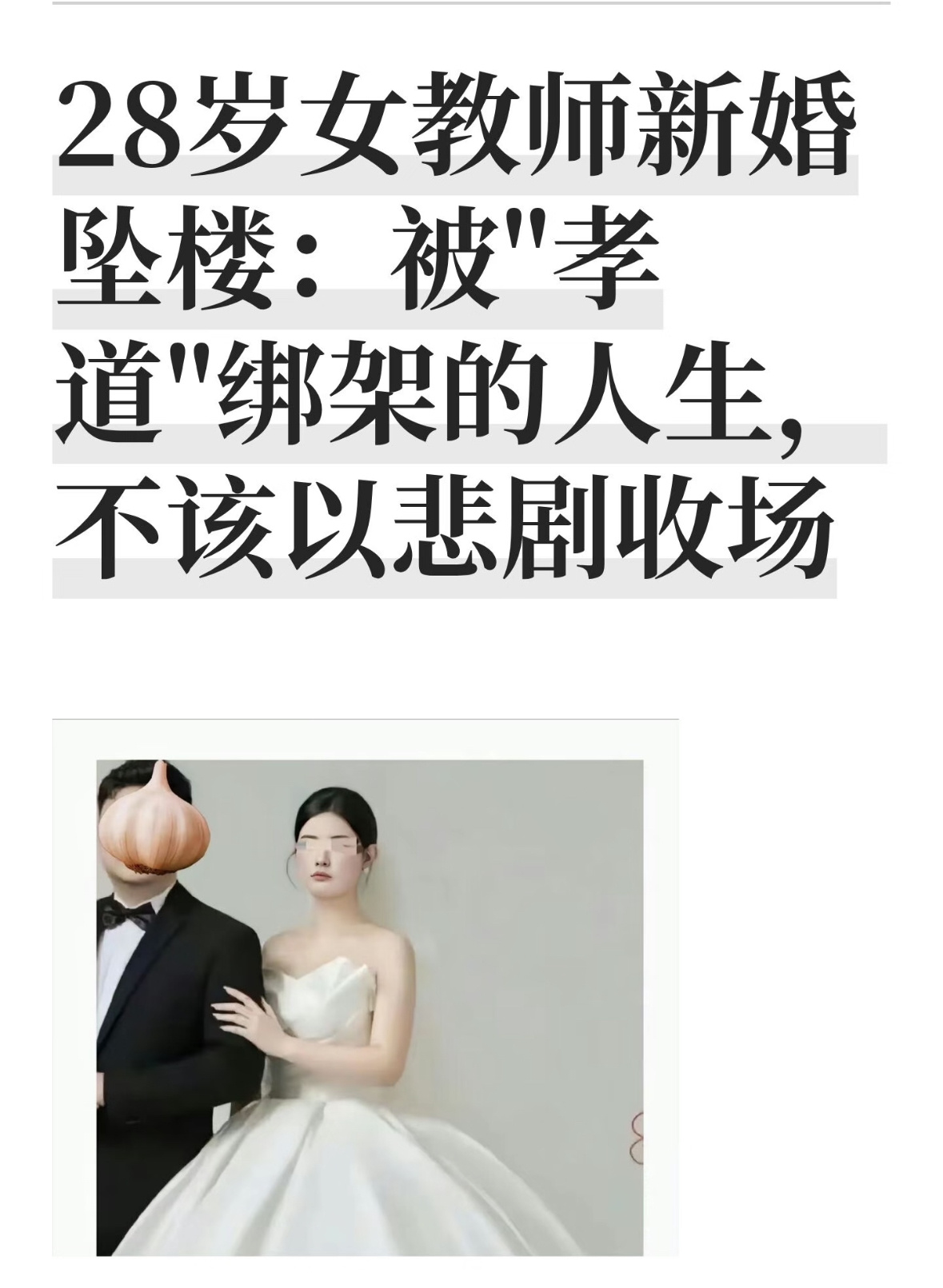鲁山教师不堪11年催婚压力,最终结束生命,追求自由鲁山28岁女教师有编制、长相漂亮的她,却在新婚当天从7楼坠落,只留下一封让人窒息的绝笔信“对抗11年,我还是输了”,大学4年加工作7年,她吵过闹过甚至以极端方式反抗,可在家人眼里,她最大的价值就是结婚。听话相亲后,父母给了钱,亲戚夸她懂事,更寒心的是,她坠楼后娘家说人已嫁出,婆家称尚未成婚,遗体竟无人认领。那些口口声声为她好的人,在意的从不是她的幸福她本有体面人生,却成了传统观念的祭品。这世上最残忍的,莫过于以爱为名的控制。愿她在有风有太阳的地方真正自由,也愿每个女孩都能为自己而活事件原因仍在调查中,尚无证据表明与工作压力、家暴或其他旧案相关。后续需等待警方或官方通报厘清关键疑点