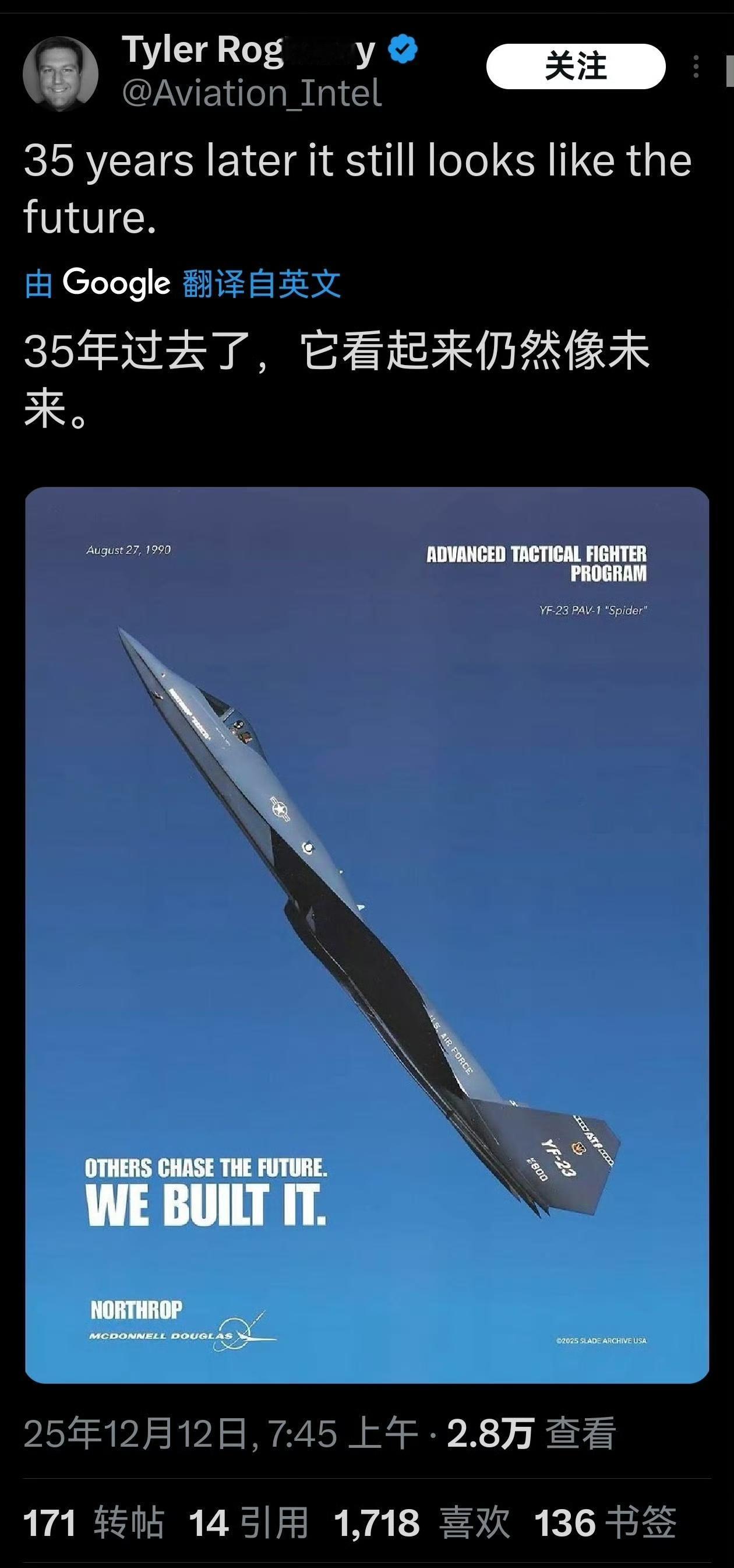 战区网站主编面对美国军工研发制造的惨烈现状,又在幻想YF23了 [偷笑] 可惜以90年代初美国空军的务实态度,只会选择YF22,不会选择YF23这个大饼。要知道YF23的标配发动机-YF120是变循环发动机,美国到今天为止连原型机都没造出来 [看] 即使当年看起来十分科幻的YF23,面对东大的两款六代机也早已落后了。而美国人却还在幻想和怀念它,认为YF23十分先进像未来产物 [笑哭] PS:F-47现在是否有垂直尾翼还是个问号?很大可能像YF23一样仍然有倾斜垂尾,这就是35年之后美国战斗机行业的真正实力 [摊手]