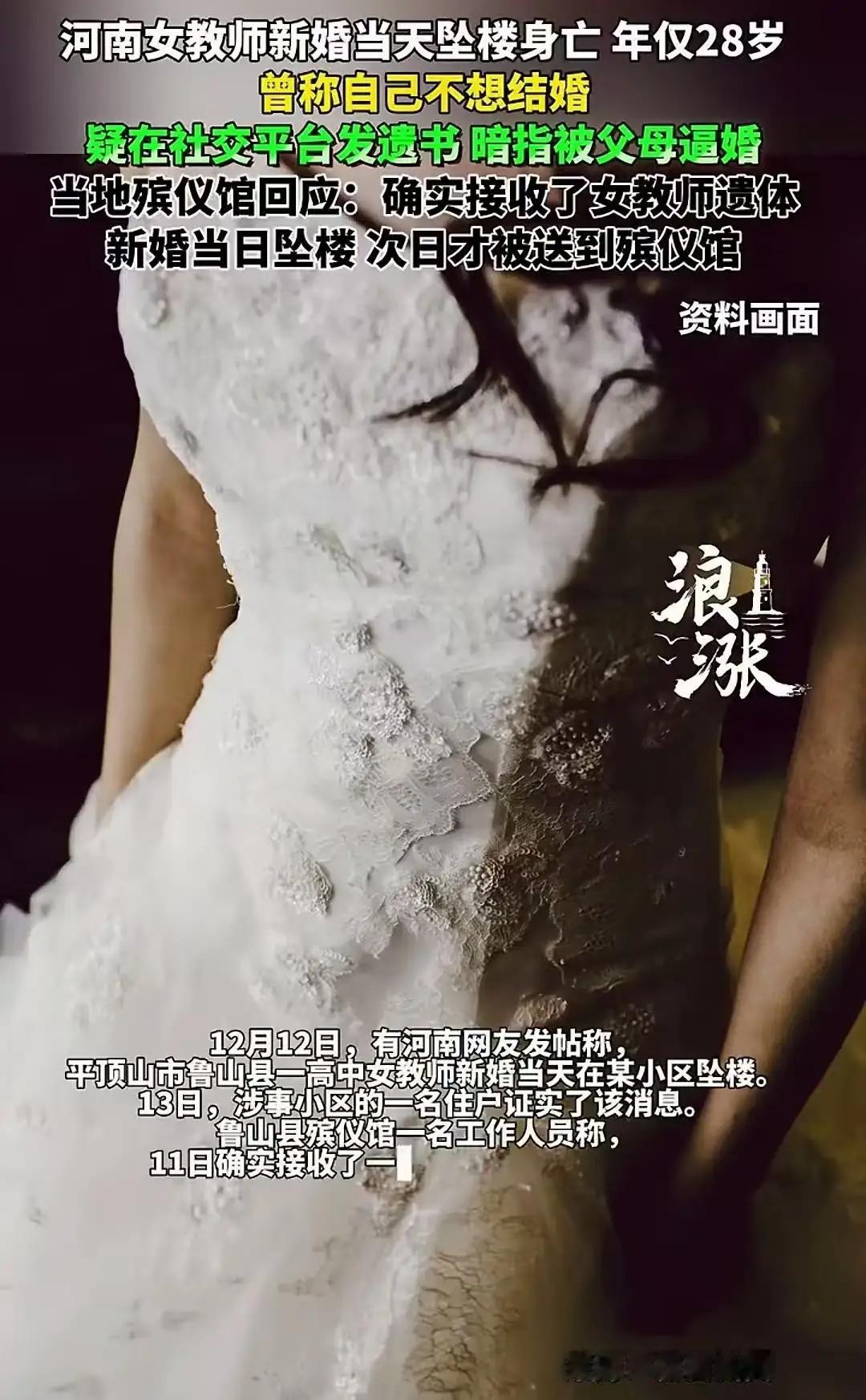 河南icon女教师新婚当天坠楼身亡,年仅28岁!生前朋友圈曝光:称自己不想结婚,被父母逼婚!网友:虽然死者为大!但结婚当天跳楼,你让男方咋想?定亲,看日子,结婚,又不是一天两天的事,为啥要选择当天…死都不怕,为什么不跑? 河南icon女教师新婚当天坠楼身亡,年仅28岁!生前朋友圈曝光:称自己不想结婚,被父母逼婚!网友们的第一反应,或许都是震惊、惋惜,甚至是愤怒。毕竟,人生最重要的,难道不是追求幸福、自由和尊重吗?然而,细细想来,这背后隐藏的,却是无数家庭、社会深层次的矛盾与压力。 有人说,结婚是人生的大事,是幸福的开始,但对她来说,或许却成了无法承受的重负。朋友圈中,她坦白了自己的心声:不想结婚,被父母逼得喘不过气。这样的话语,令人心碎,也令人深思。我们是不是太快就把“结婚”变成了“人生必经的路”?是不是忘了,婚姻应该是两个人的事,而不是家长的“命令”? 然而,令人难以接受的是,她选择在最重要的日子结束生命。有人会问:为什么不跑?为什么不坚持?但试想一下,一个28岁的年轻女孩,面对家庭的压力、社会的期待,内心的恐惧和绝望,能有多少勇气和力量?她或许曾经挣扎过,试图说服自己,也许甚至试图逃离这个“牢笼”。但最终,还是走到了绝路。 这件事情,让我们不得不反思:我们到底在追求什么?是幸福,还是“面子”和“传统”?我们是否太过重视“形式”而忽略了“内心的声音”?在这个社会,很多年轻人面对父母的期望,压力山大,甚至不得不牺牲自己的人生。我们是不是该停下来,问问自己:我们是否给了他们真正的自由和尊重? 更让人心疼的是,男方的感受也值得思考。结婚当天发生这样的事情,让人难免会想:他会怎么想?会不会觉得自己成了“替罪羊”?还是会觉得自己被卷入了一场没有准备的“悲剧”?这不仅仅是一个家庭的悲剧,更是整个社会对年轻一代价值观的反思。 或许,我们都应该从这件事中学到一些东西:尊重每个人的选择,理解每个人的苦衷。不要让传统的枷锁束缚了年轻人的心灵,也不要让父母的期待变成无法承受的重担。生命只有一次,幸福也只有自己才能定义。愿逝者安息,也希望每个家庭都能多一些理解和包容,让“幸福”不再遥不可及。 最后,留给我们的,是沉重的反思和深深的叹息。我们都在追求一个更温暖、更理解的社会,也许,从现在开始,改变就从倾听每一个“不同”的声音开始吧。