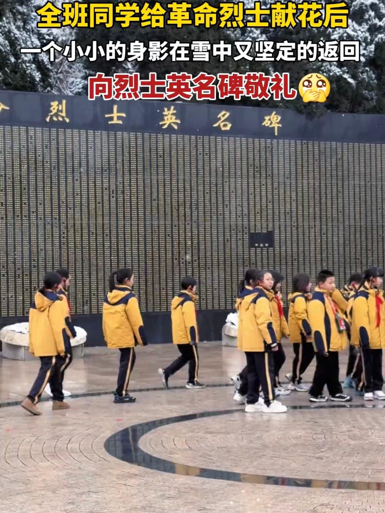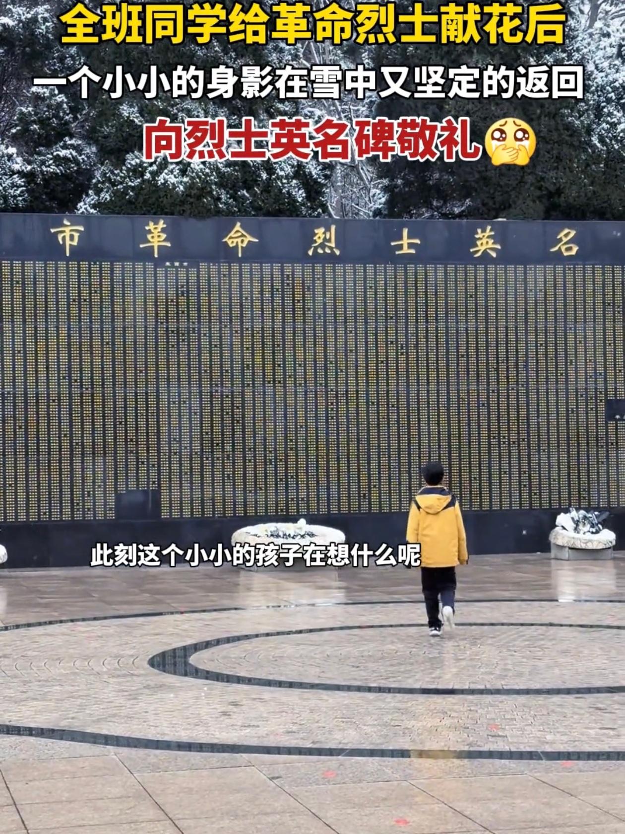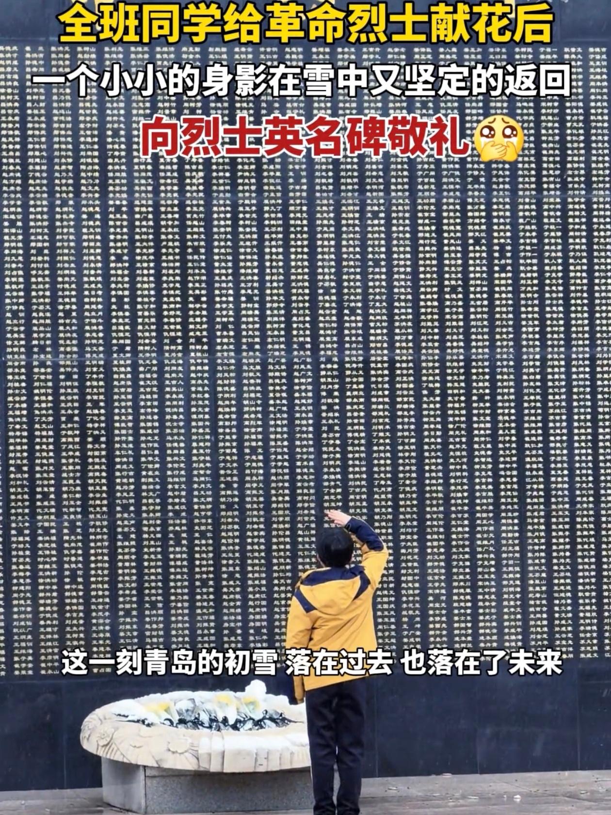 青岛革命烈士纪念馆门口,12月下着雪,学校组织孩子们来献花缅怀,活动结束了队伍散了,老师带着学生往回走,一个男孩忽然跑回去,站在烈士英名碑跟前,雪落在帽子上肩膀上,他立得直直的举手敬礼,周围没人催他,他就那么敬着。 这孩子穿着校服戴着红领巾,手举到额头那儿一动不动,雪一片片往下掉,碑上刻的名字密密麻麻,他就对着那些名字站着,敬完礼才转身小跑追队伍,路过的人看见了停一下,有人拿手机拍,画面传到网上,大家都说这孩子懂事。 老师后来讲,活动时他挺认真,听志愿者讲烈士的故事眼睛不眨,献花时也排得端正,没想到走了又折回去,可能心里还有话想跟烈士说,小孩子的想法直接,觉得该做就去做了,不像大人想那么多。 有网友评论说,现在的孩子能记住这些已经不容易,学校天天讲爱国讲传承,真正听进去的有几个,这男孩自己跑回去敬礼,说明他心里装着事儿,红色教育不是走过场,种子种下去总会发芽。 也有人担心孩子在雪地站太久会不会冻着,雪那天下得不小,地上积了一层,孩子手举那么高,胳膊会酸,老师没拦着算对的,这种时刻大人别打断,让他把心里的敬意表达完。 这一幕其实提醒我们,教育不光是课本上的字,还得让孩子真正感受到什么叫英雄什么叫牺牲,碑上的名字不是符号,那是一个个活过的人,为了后来的日子拼过命,孩子能想到这一层,这趟来得值。 你们觉得,学校该不该多组织这样的活动?