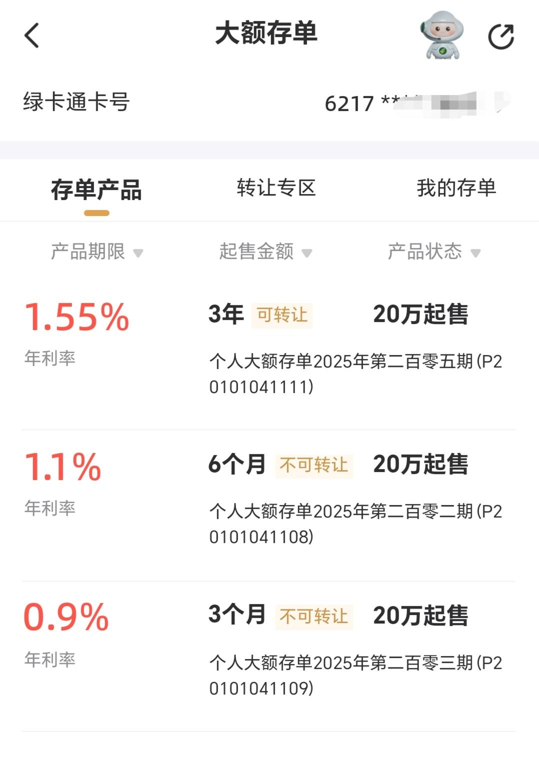 手中有点闲钱,想在手机银行存个定期。我纠结那家银行定期利率高点,就选那家银行存。 我拿出手机,打开好几家银行的APP,对比一下定期利率情况。 对比来对比去,发现国有4大银行,除了建行的3年期定期年利率是1.55%外,起存门槛为5万元;5年期年利率为1.6%,起存门槛为20万元。其它1~3年的定期存款利率都差不多,都在0.95%~1.25%之间。3年期以上的起存门槛也是5万或20万。 我又打开邮政储蓄银行的App,发现它家3年期“邮享定存”类,存款利率最高为1.55%,5年期最高利率为1.3%。起存门槛50元。 但我弄不明白的是:它家的大额存单3年期定存利率也是1.55%,可以转让,起存门槛20万。5年期定存利率是1.6%,其他和3年期定存一样的要求。这大额存单,与“邮享定存”类3年期、5年期定存有啥区别呢? 有没有懂的,能不能给个解释和建议呢?
