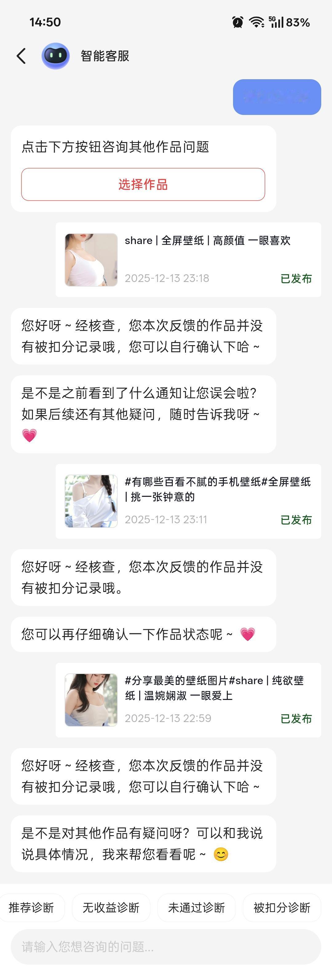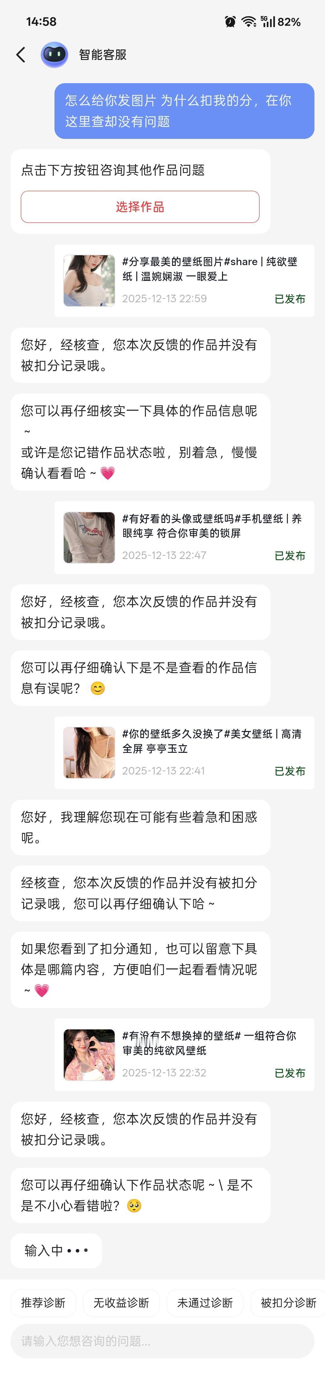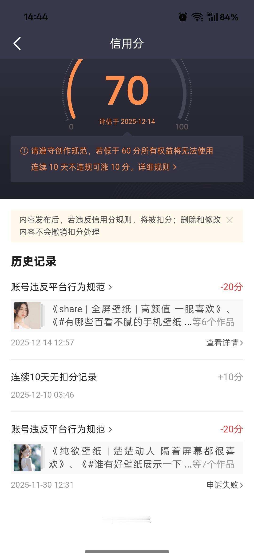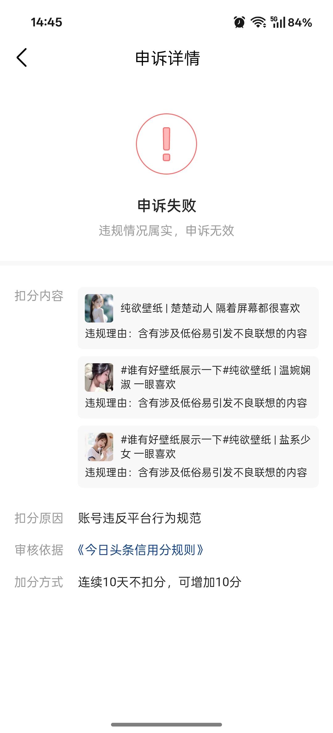 被扣分了!原因是作品涉及低俗易引发不良联想的内容。这上传的图片没暴露没色情也无不良引导,正常的美女时尚穿搭,怎么就引发不良联想了,我乖!各位条友,你们有遇到这种情况吗?联系客服,检测也是没有问题,但是就是扣分了,之前就被扣一次,申诉还失败了 不明不白
