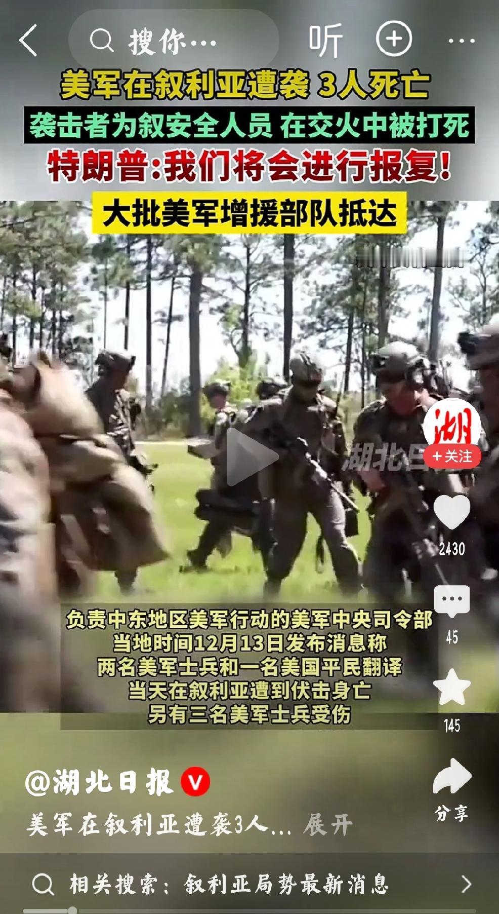 失控,这就是美国霸权吗? 个人观点:个人猜想,美国民众,无论是共和党,还是民主党,闻听此事,都会目瞪口呆,心中不由得问道:“难道美国的脸面,居然被叙利亚践踏在脚下?” 个人认为:这是一个可以改变历史的黑天鹅事件。这是赤裸裸的,毫不留情的践踏,美国脸面的事件。 全球瞩目,显微镜式观察,美国总统特朗普如何应对此事? 美国是支持叙利亚,而且美国总统特朗普在不久前,刚刚在白宫,全球关注下,为叙利亚现任领导人,喷了香水,如果不超数月,美国人在叙利亚就遭遇了偷袭,造成死伤结果。