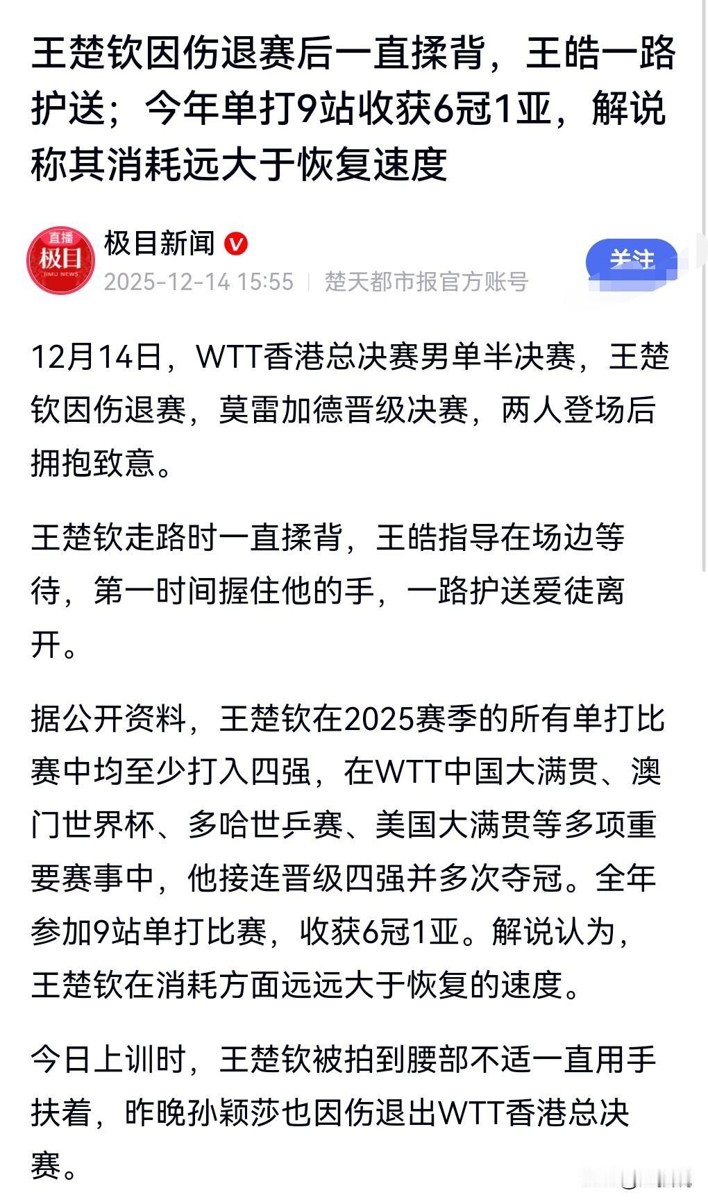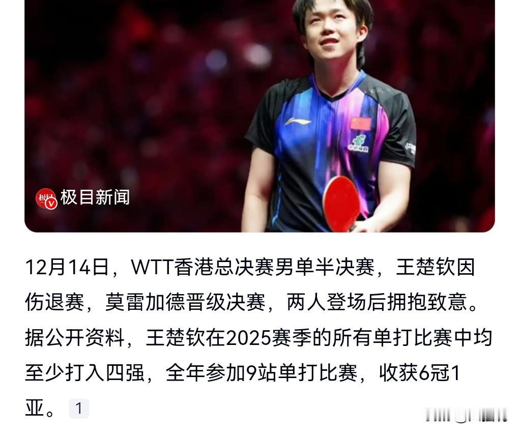 王楚钦的实力是毋庸置疑的。 王楚钦今年单打9站6冠。 这个实力不容小觑啊,不愧是国内数一数二的高手啊。 不过这次香港的比赛,由于伤病无奈只得退出。 身体是革命的本钱。 对一个运动员来说,那确实如此。 身体不行那就没必要勉强了。 等恢复后再次比赛。