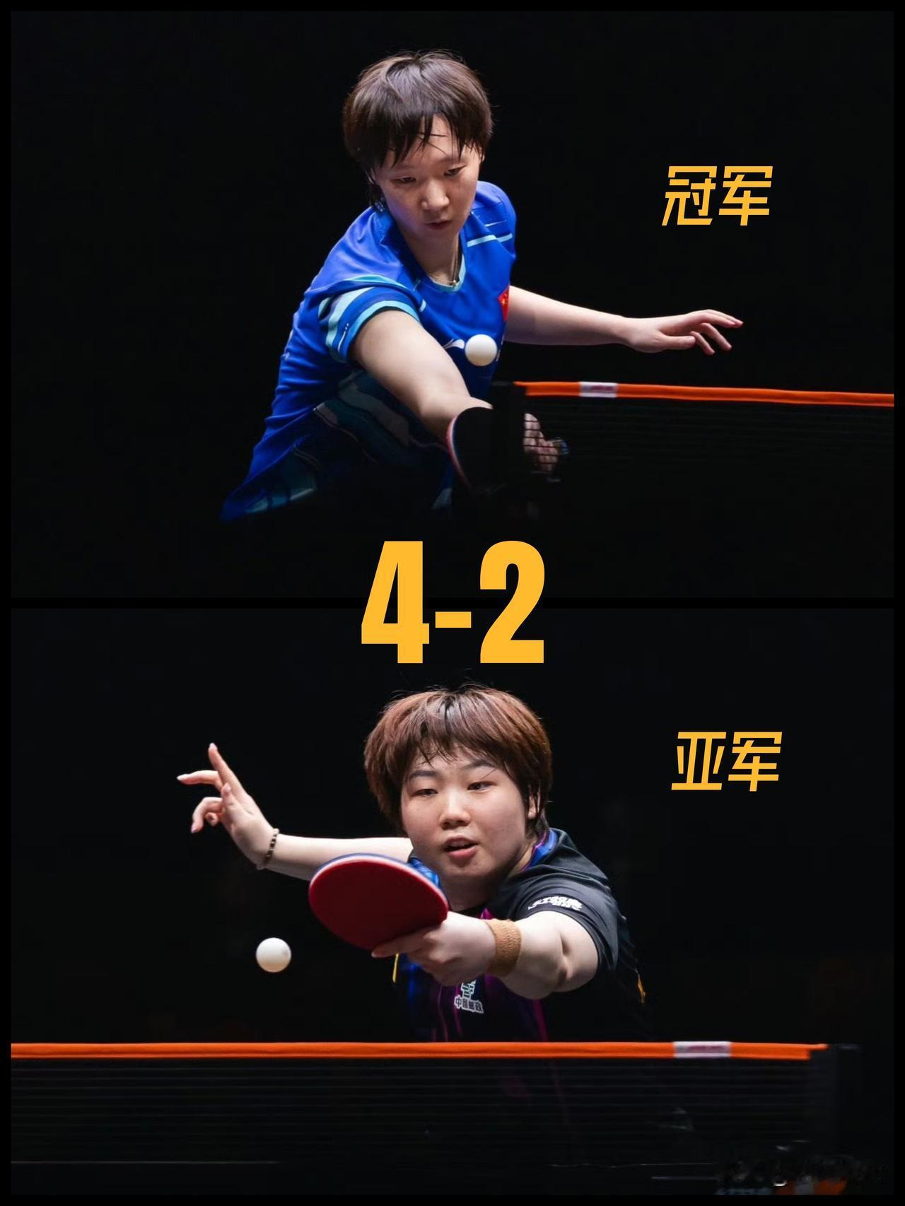 【六局击败蒯曼!王曼昱蝉联年终总决赛女单冠军!】 WTT香港总决赛女单决赛,2号种子王曼昱4-2击败队友蒯曼夺得冠军,六局比分:11-7、8-11、11-8、11-8、9-11、12-10。 恭喜王曼昱蝉联年终总决赛女单冠军,恭喜蒯曼获得香港总决赛女单亚军。 本届香港总决赛女单唯一的遗憾就是孙颖莎伤退,没能上演双子星王牌巅峰对决!