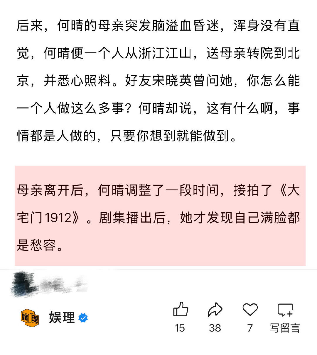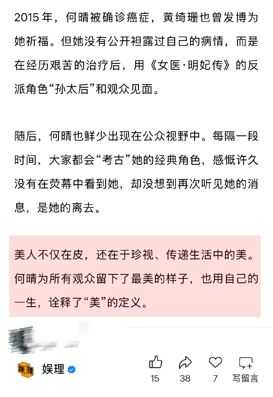 何晴劝黄绮珊别去整容 何晴和许亚军的家人都是好朋友 何晴曾提到自己最大的遗憾,就是没有更多陪伴父母,这也是演员职业的特性所在。2015年,何晴被确诊癌症,黄绮珊也曾发博为她祈福。但她没有公开袒露过自己的病情,而是在经历艰苦的治疗后,用《女医·明妃传》的反派角色“孙太后”和观众见面。随后,何晴也鲜少出现在公众视野中…娱理独家↓