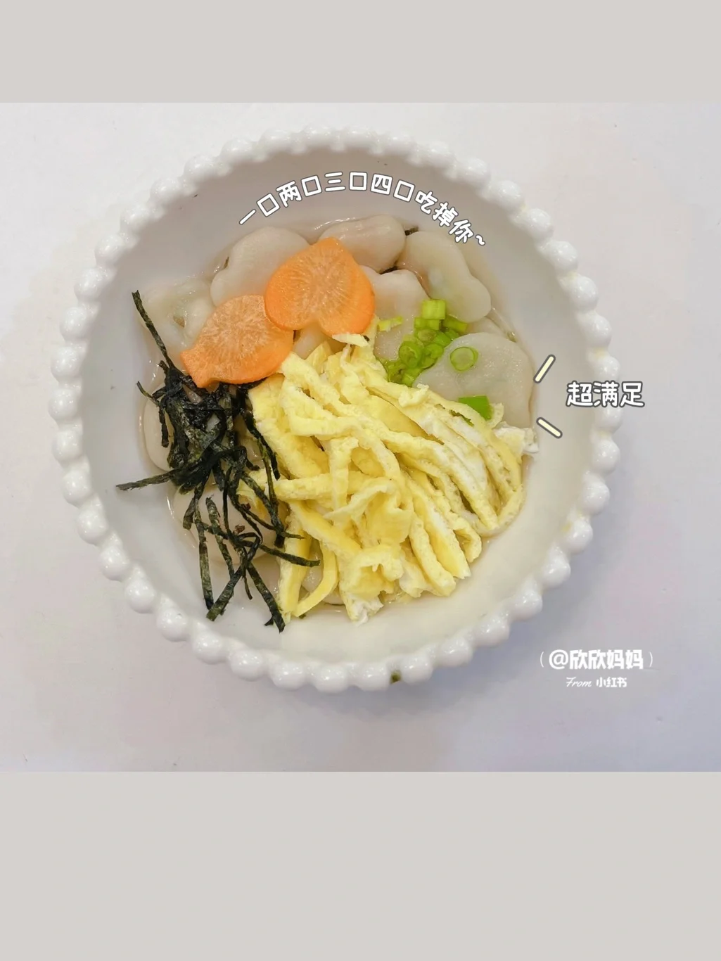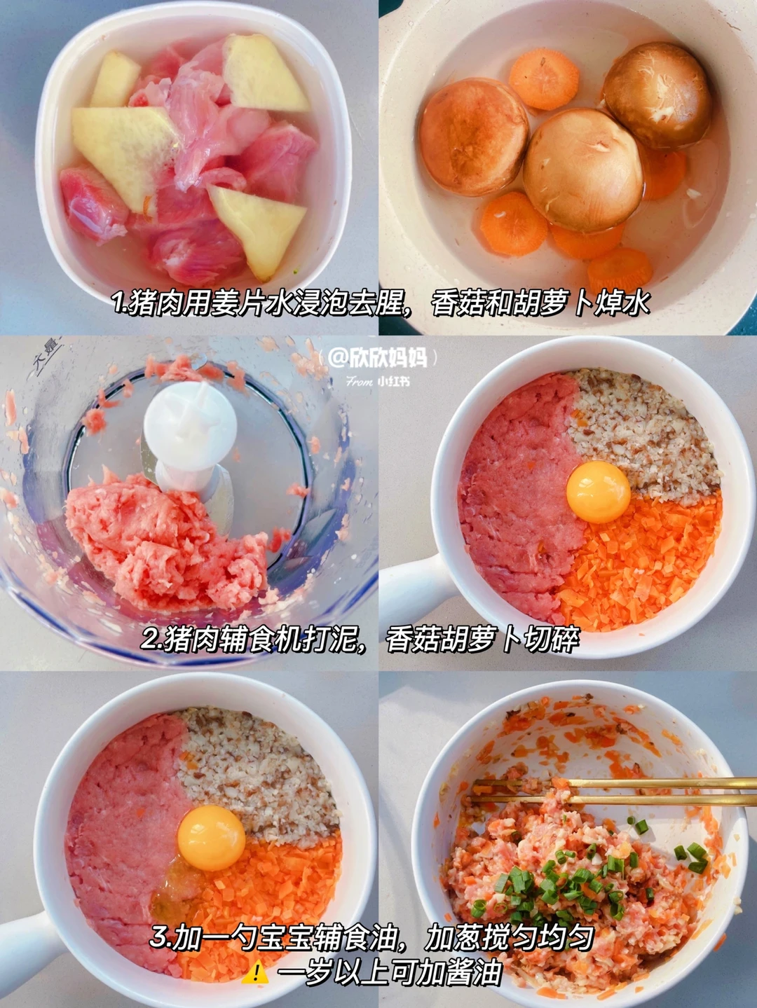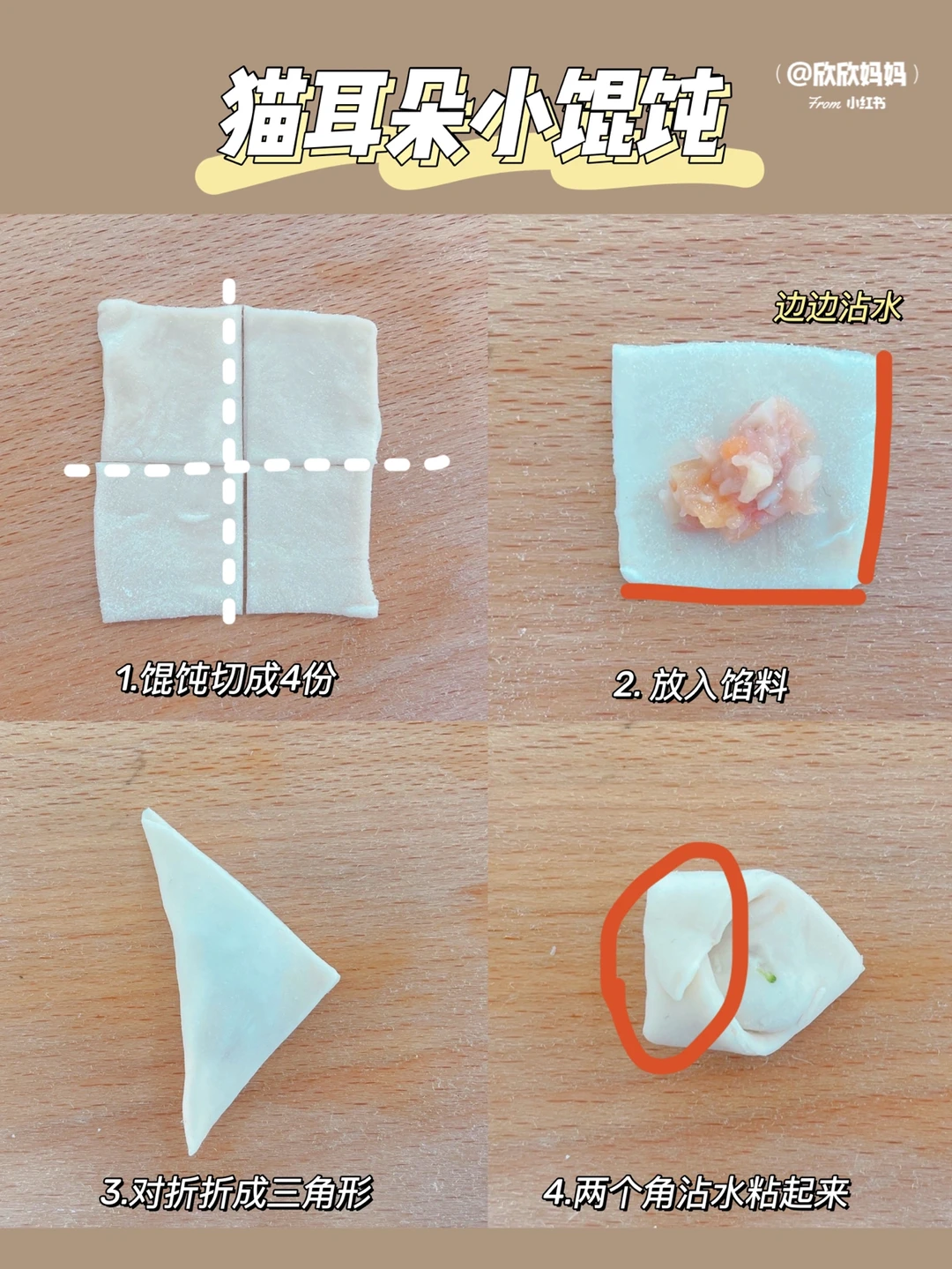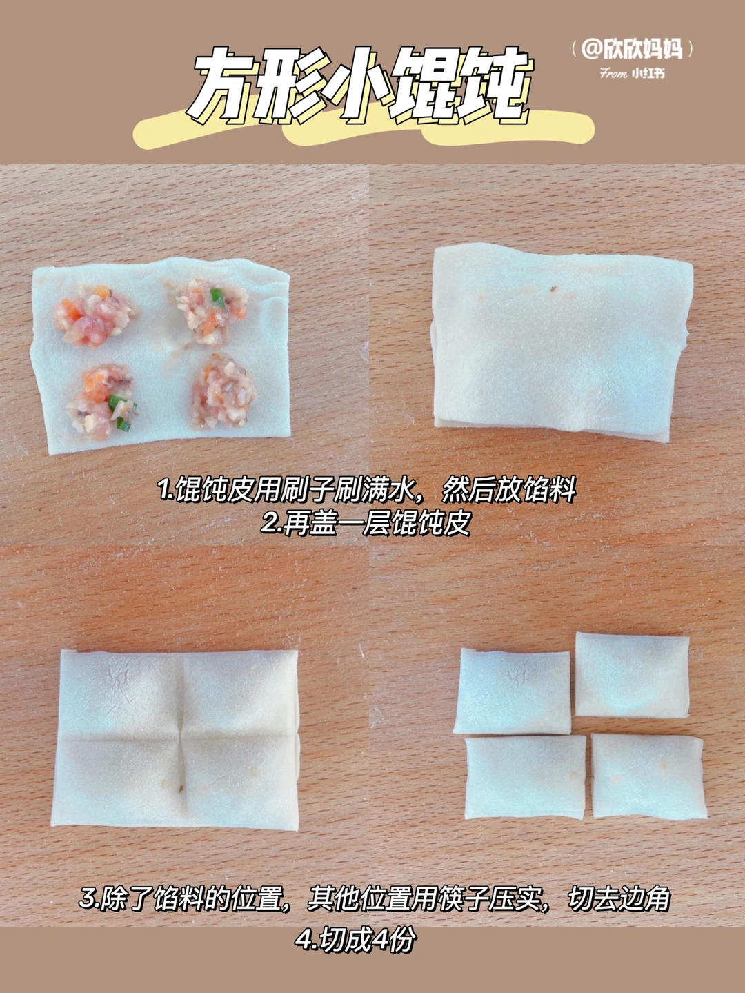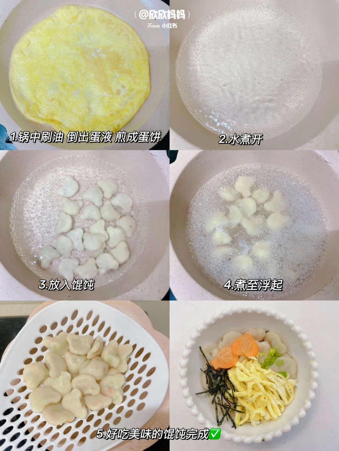 小欣欣11月龄解锁了小馄饨 今天给大家分享4种小馄饨包法:包学包会哦! 搭配上自制的馅儿炒鸡鲜美 有菜有肉 营养满满 而且方便保存 冷冻起来 随吃随取 新手妈妈也可以轻松上手哦! 〰️〰️〰️〰️〰️➰➰➰〰️〰️〰️〰️〰️ 【具体做法看图片哦】 图4:方形小馄饨 图5:猫耳朵小馄饨 图6:熊仔小馄饨 图7:金鱼小馄饨 〰️ 【香菇胡萝卜猪肉馅儿】 🛒准备材料: 猪里脊、蛋黄、香菇、胡萝卜 👩‍🍳做法: 猪肉用姜片水浸泡去腥,香菇胡萝卜焯水后切碎。猪肉辅食机打泥,加入蛋黄,一勺宝宝辅食油,少许葱花搅拌均匀 〰️ 【馄饨煮法】 1:锅中刷油,倒入蛋液煎至蛋液凝固切成蛋条备用 2:锅里烧水,水开下馄饨,煮至馄饨浮起,再稍微煮下就可以啦 3:然后放入蛋条,少许葱花即可 〰️ 【保存方法】 多的馄饨放入保鲜袋,密封冷冻可以保存一个月哦! 宝宝辅食mini小馄饨|宝宝辅食日记
