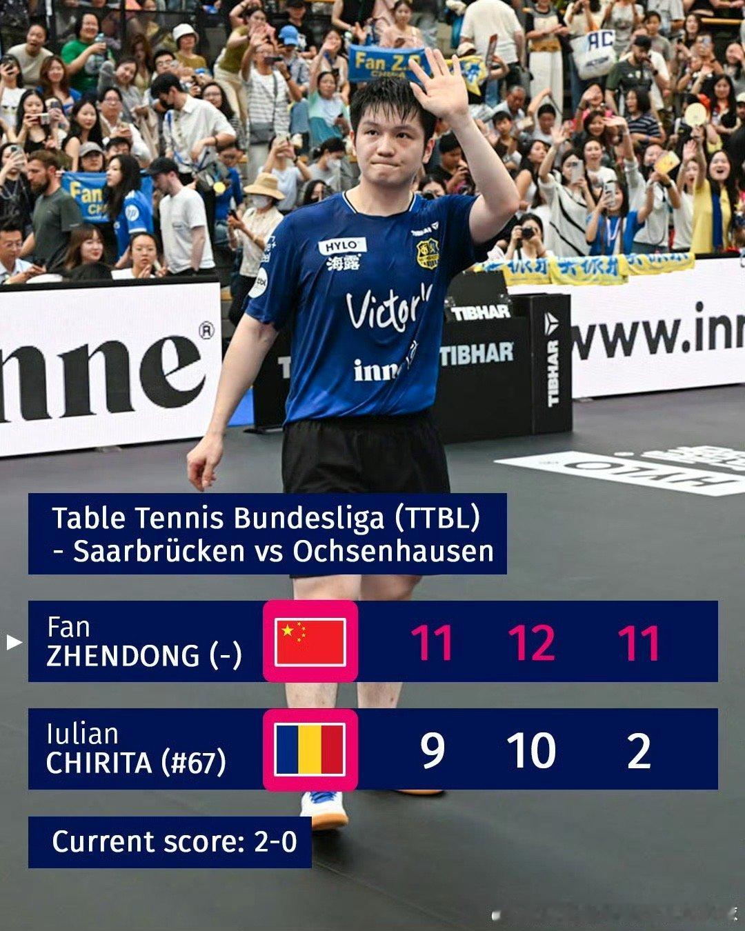 樊振东3比0奇里塔025-2026乒乓球德甲联赛第十轮vs奥克森豪森,第二盘出场,3比0(11-9,12-10,11-2)战胜奇里塔,帮助球队2比0大比分领先