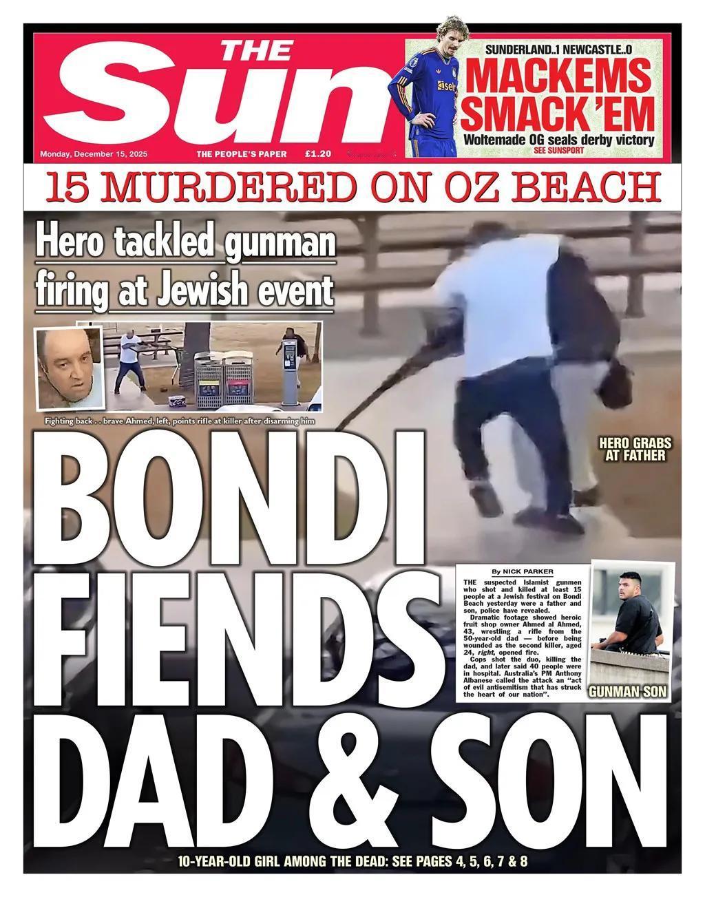 英国《太阳报》报道,在悉尼发生致命枪击事件的两名持枪者是一名50岁的父亲和他的24岁儿子。报纸补充说,一名商店老板从其中一名持枪者手中夺下了一支步枪。
