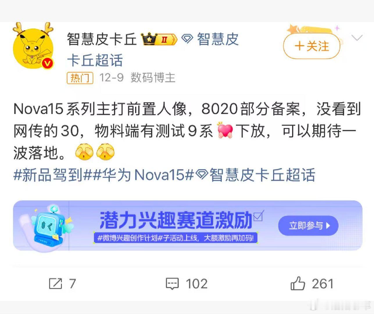华为nova15来了 易烊千玺和他的nova“八年之约”迎来新成员!海报里的nova 15,全新的横向镜头模组设计让人过目不忘。主打色又潮又飒,机身轮廓硬朗,显得特别有力量感。那块流光溢彩的背板,大概率用上了新科技材料,好看的同时据说还很扛造。八年了,他和nova共同进步,这次这款“轻薄酷盖”,估计又要成为爆款。华为12月新品发布会官宣
