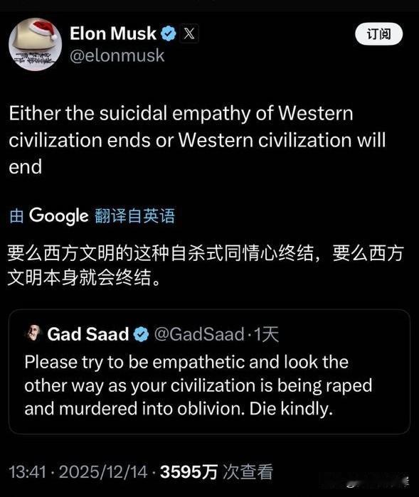 马斯克:西方文明的这种自杀式同情心要么终结,要么西方文明本身就会终结。