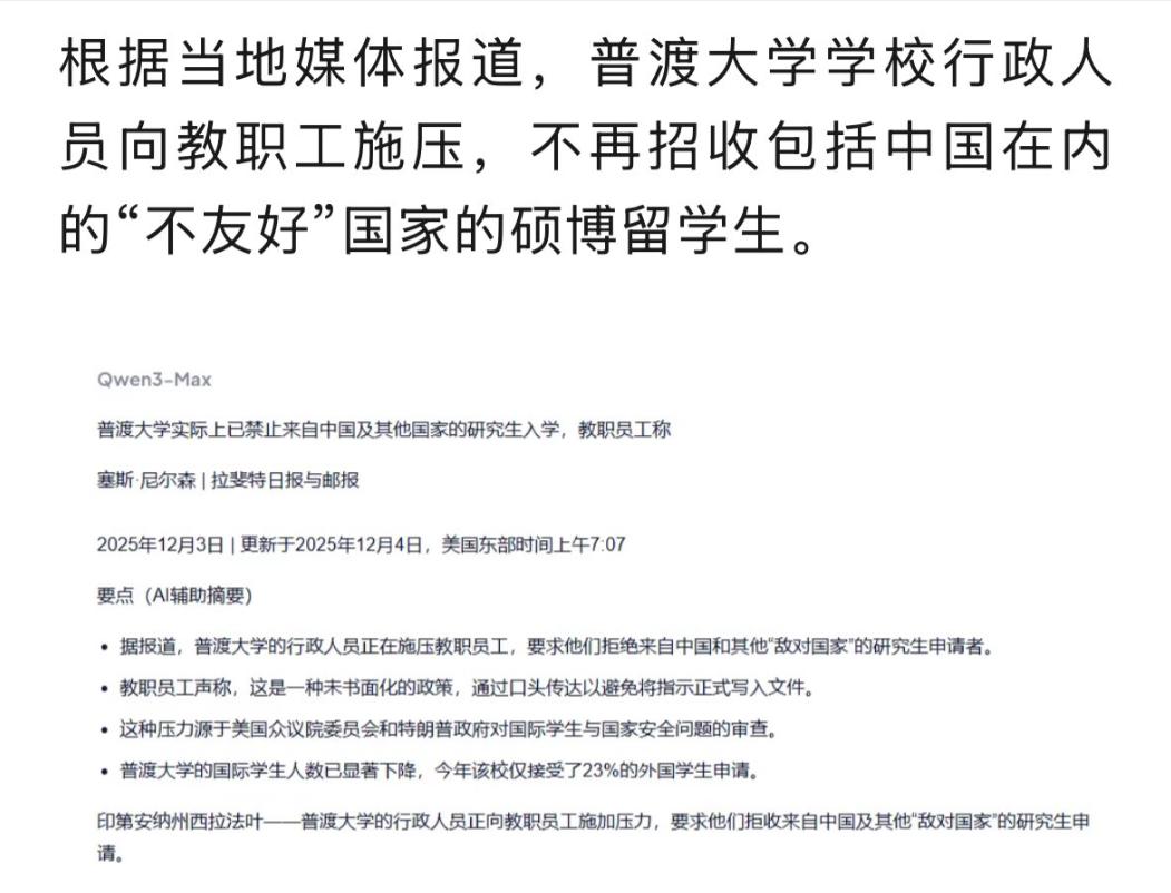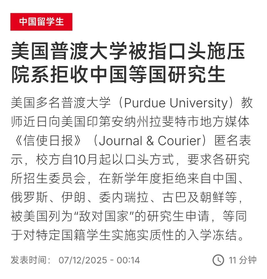 美国普渡大学决定拒招中国留学生,做出这项决定的是该校校长蒋濛。蒋濛出生于天津,在香港长大,后移民美国,2023年出任普渡大学第13任校长。 1977年生于天津筒子楼的蒋濛,11岁随父母赴香港投靠祖母,在天主教小学重读五年级时,他每天清晨五点起床背诵粤语童谣,半年后以全优成绩考入香港名校皇仁书院,1995年以“十优状元”身份获得赴美留学资格。 斯坦福大学8年连读本硕博,普林斯顿最年轻正教授,2017年执掌普渡工程学院,2023年成为该校第13任校长——这段堪称“美国梦范本”的履历,却在2025年因对华政策急转直下而充满争议。 作为移民二代,蒋濛的选择充满现实考量,普渡大学70%的科研经费来自联邦政府,其中不乏NASA、国防部的敏感项目。 2025年3月,美国众议院中国问题委员会要求普渡提交中国学生的“全维度数据”,包括实验室项目、资金来源甚至本科母校。 蒋濛团队不仅在48小时内交出50页报告,更在随后的内部会议中强调:“我们必须成为合规典范。” 这种姿态,让普渡从“中国学生的摇篮”变成了“政策试验田”——2024年中国本科新生仅14人,较十年前暴跌98%;2025年秋季,100余名已获录取的中国研究生被临时取消资格,理由栏写着“行政决定”。 而且普渡的“拒招”并非一刀切,而是精心设计的“程序规避”,管理层通过院系例会、私下谈话等非书面形式传达导向,要求招生委员会“在初审阶段减少中国学生材料的通过率”。 一位工程学院教授透露:“以前我们会给优秀中国学生‘保底录取’,现在必须在推荐时标注‘需谨慎’,否则研究生院会直接打回。” 这种操作既避免了《民权法案》的法律风险,又将歧视性后果转嫁给基层教员。 数据最能说明问题:2024年普渡中国研究生占比从2019年的18%降至10.8%,而印度学生占比升至22%。校方在给国会的报告中特别强调“中国学生在STEM领域的集中度”,却回避了一个事实——普渡工程学院70%的博士生奖学金来自校企合作,而非联邦经费。 这种“选择性合规”,本质是用中国学生的权益换取政治安全,蒋濛在2025年校友会上直言:“普渡的使命是服务美国国家利益。”这句话,让他从“华人骄傲”变成了留学生口中的“黄皮白心”。 普渡与中国的渊源可追溯至1904年,首位中国留学生王丰镐从这里走向铁路建设,百年间,邓稼先在此奠定核物理基础,胡佛水坝的图纸上留有普渡工程师的印记。 直到2013年,该校中国本科生仍达3004人,占国际生总数的45%。 但2018年后,随着美国对华科技战升级,普渡的态度逐渐转向。 2022年,该校取消与清华、中科大的联合实验室;2024年,禁止中国学者参与联邦AI项目;2025年的隐性禁令,彻底切断了中国学生的上升通道。 蒋濛的矛盾在此凸显:他推动普渡与台湾高校的半导体联合培养计划,却终止与大陆高校的所有学术交流;他在公开演讲中缅怀“普渡的中国先驱”,私下却要求院系“减少亚裔面孔”。 这种分裂,源于他对自身定位的焦虑——作为少数族裔校长,必须用更激进的“忠诚证明”巩固权力。一位接近校方的人士透露:“董事会曾暗示,对华强硬是蒋濛坐稳位置的关键。” 普渡的转向,也撕开了美国留学的残酷现实,2025年,UIUC中国学生录取率降至5.2%,CMU工学院取消“中国学生专项奖学金”,NYU的RD轮次中,中国申请者的waitlist率高达67%。 这些变化背后,是美国对华战略的深层调整——从“利用人才”转向“防范风险”。 中国学生曾经的“保底校”,如今成了需要“政审”的敏感地带。 最受伤的是那些怀揣学术理想的年轻人,2025年被普渡取消录取的学生陈雨桐回忆:“我凌晨三点收到邮件,说‘基于国家安全考量’。 可我的研究方向是农业基因改良,和国防毫无关系。”这种无差别排斥,让美国大学的“学术中立”神话破灭。 正如普渡退休教授詹姆斯·库克所言:“我们正在用政治滤网筛选学生,这比麦卡锡主义更隐蔽,也更危险。” 蒋濛或许不会想到,他的决定正在改写两代华人的命运:祖父辈放弃美国优渥生活回国建设,孙辈却要用拒招证明对美国的忠诚。 这种历史的吊诡,映照出全球化退潮期的个体困境,当普渡的钟楼不再为中国学生敲响,当邓稼先的铜像旁鲜有同族身影,那些曾被视为“桥梁”的华裔精英,终究成了筑墙的砖石。 而这场始于普渡的隐性排斥,正在重塑整个美国留学的未来图景——它不再是梦想的彼岸,而是充满不确定性的险途。