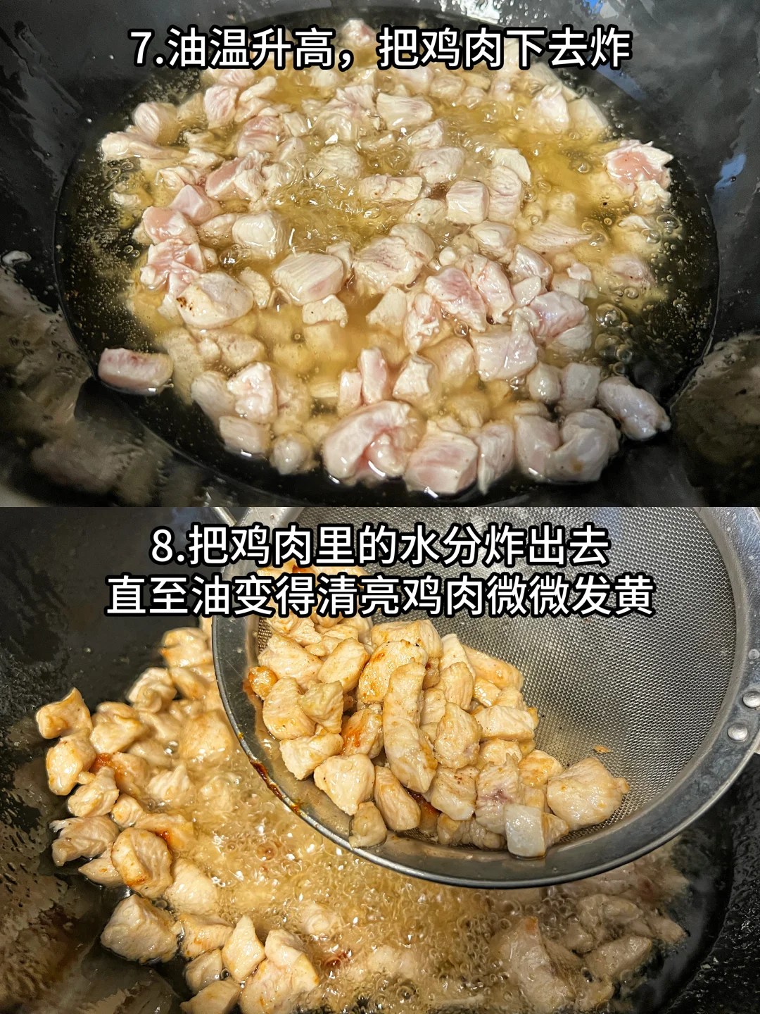 8、把鸡肉里的水分炸出去直至油变得清亮鸡肉微微发黄
