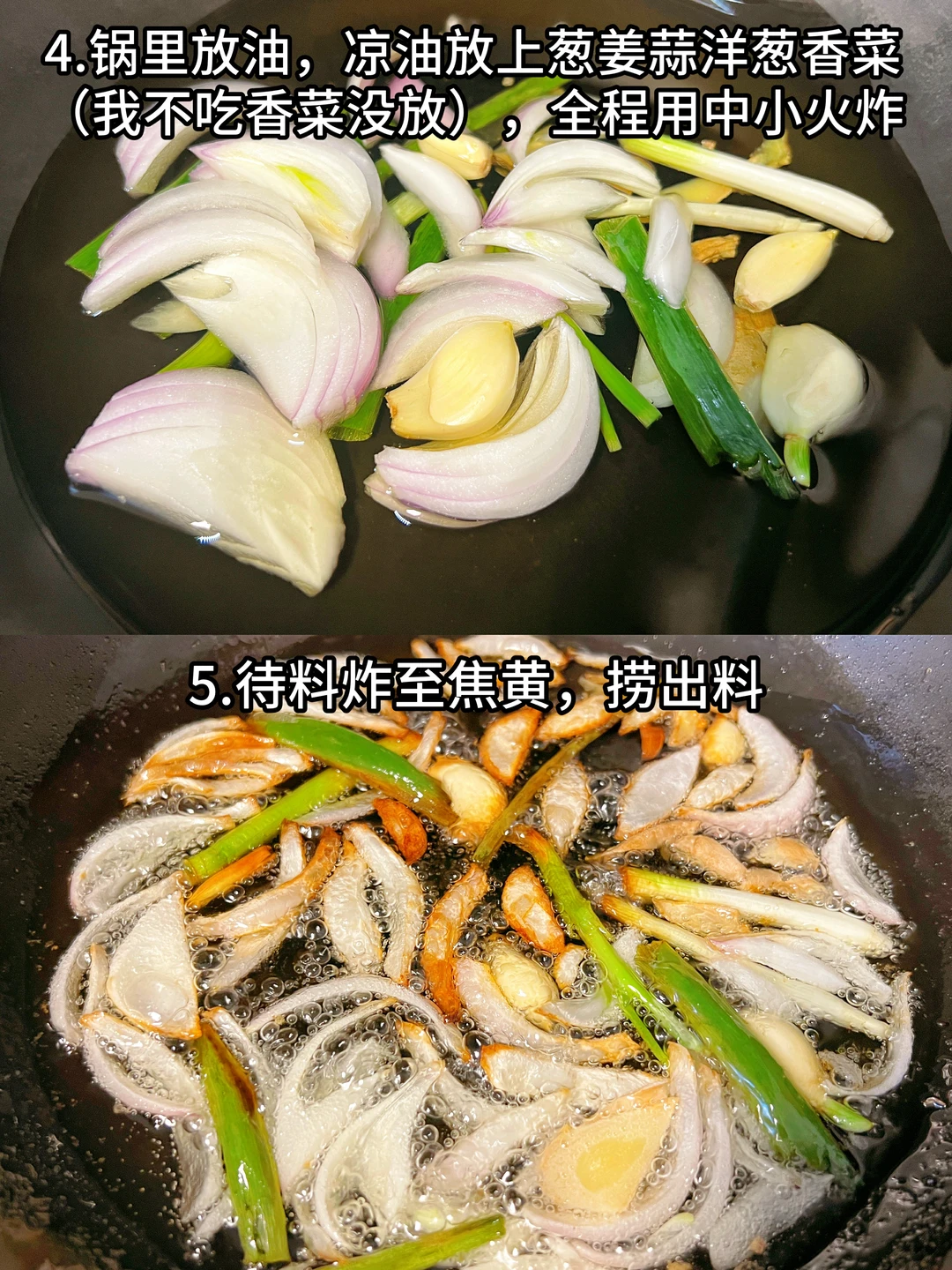 4、锅里放油,凉油放上葱姜蒜洋葱香菜(我不吃香菜没放),全程用中小火炸