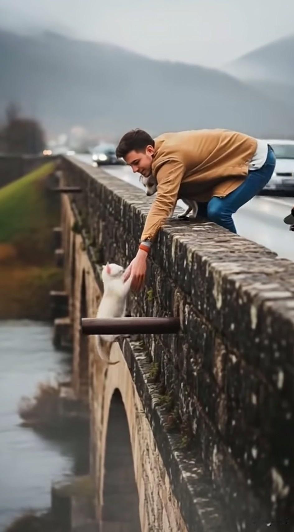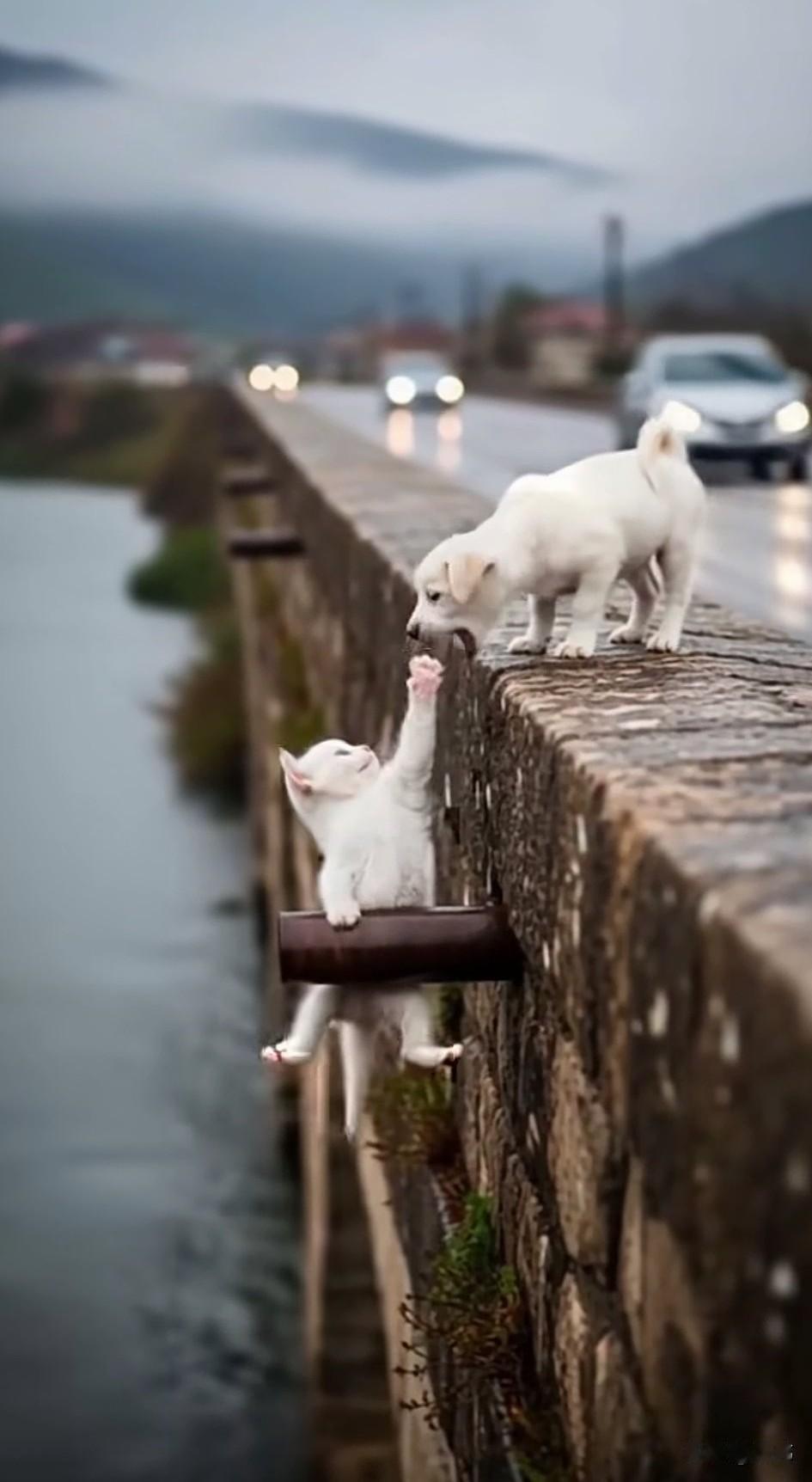 泪目了!一只小流浪狗在流浪的过程中认识了一只小流浪猫,它们成了好朋友,每天一起找吃的,一起睡,这天它们来到一座桥上玩耍,可小猫居然不慎从栏杆滑落,幸亏它抓住了下面的一根铁柱,才没有直接掉下去,可长时间的坚持,很快它就没有力气了,而狗狗几次伸出爪子让小猫抓住自己,均以失败告终。 眼看小猫就要发生危险,狗狗立刻跑到马路上求救,它看到一辆货车开过来,直接冲到马路中间大叫,逼停了货车,幸运的是货车司机是一位善良的小哥哥,他在抚摸了狗狗之后,狗狗拼命朝着小猫的方向大叫,小哥哥立刻心领神会跟了过去,这才看到了遇险的小猫,小哥哥救起了小猫。 他也被这对好朋友的感情所感动,于是决定收养它们,把它们带上了货车,相信在他的照顾下,这对好朋友也会越来越好的。
