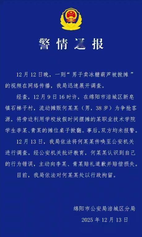 赔礼道歉加赔偿,还被拘留数日,男子因抢生意,掀翻大学生的小吃摊被处罚! 这是正规派出所,当事人未报警却主动出击!人民警察及时惩处鸡毛蒜皮的违法行为,彰显了警察履行为人民服务职责的实干精神,大赞! 可以合理竞争,但不许霸行霸市!大学生还是孩子,为了生活勤工俭学,欺负祖国的未来,天理不容。感谢警察的执法,温暖人心! 给四川警方点赞,主动处理民间琐事,避免事态升级,这样处理确实起到震慑作用,欺行霸市就应该打击,不然慢慢就变成了黑社会欺压老百姓。向当地民警点赞!