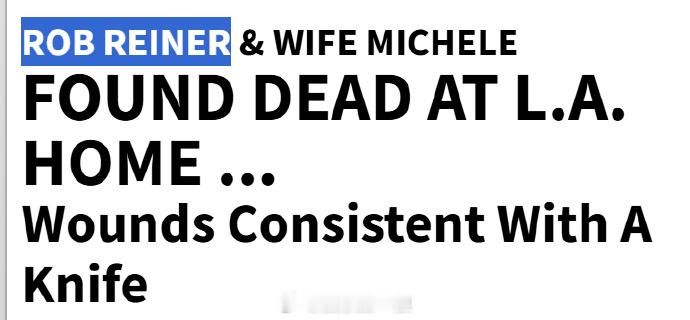 导演罗伯莱纳去世 据TMZ报道,14日下午,警方接到报警后抵达罗伯·莱纳位于布伦特伍德的住宅,发现罗伯及妻子米歇尔·辛格·莱纳已身亡,目前该住宅已被大批警力封锁。警方目前正以凶杀案方向展开调查,这对夫妇疑似被刺身亡。