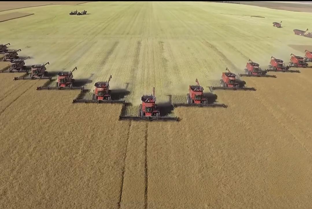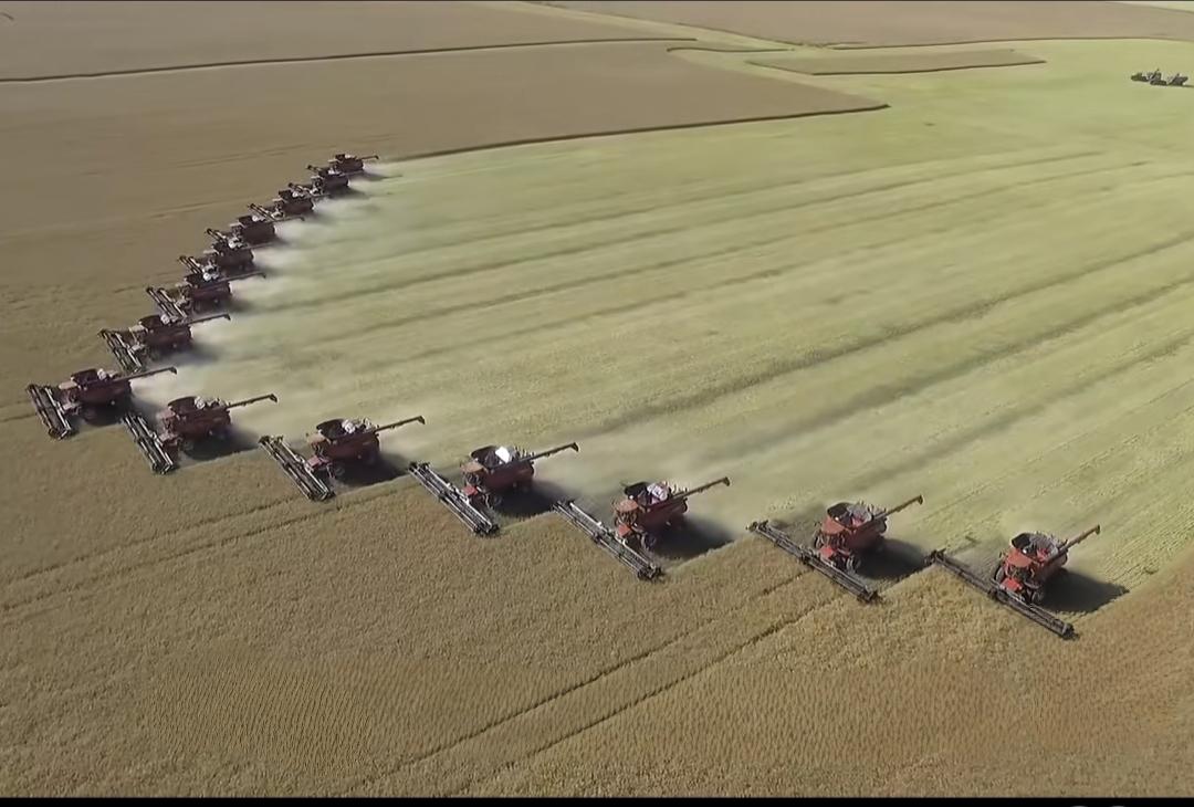 分享一张有意境的照片吧美国农场收割机列队抢收麦子的场景。好震撼啊!