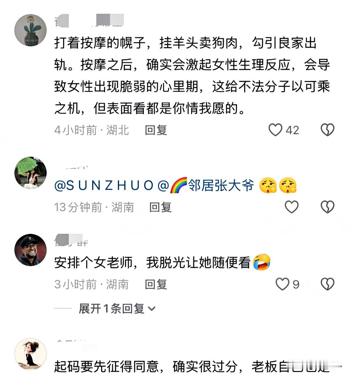 真是强词夺理!湖南长沙,女子脱掉衣服正要做SPA时,男技师却进了房间,女子吓了一跳,让男技师出去,接受不了不穿衣服,让男性按摩。可店老板却生气了:“孤陋寡闻,不给你做了,下次你不要来了!” 女子很生气,自己在不知情的情况下,被安排了男技师。 然而老板却说:“在我们这儿,这是正常流程,你去医院也有男的医生啊,” 这个事也是引起热议。有人觉得:“我是女人,我也接受不了,店老板就应该提前问好,需要男生服务还是女生服务?” 然而也有人说:“虽说脱了衣服,但全身盖着被子,SPA本来就是专业服务,别想太多。” 但我认为,第一,消费者有拒绝的权利。不管行业多“常见”,只要你提前没被清楚告知,就有权说不。 第二,行业规范也得透明。男技师、脱衣标准、服务边界,如果不提前讲清楚,那就不是“专业”,而是让人被动接受。 真正成熟的服务,不是一句“大家都这样”,而是你可以选择,我也尊重你的感受。顾客舒不舒服,比合不合规更重要。 你觉得呢?这种情况,你能接受吗? (信息来源:风芒新闻)