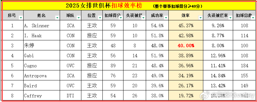 【2025女排世俱杯扣球效率榜】统计口径:整个世俱杯期间累计扣球得分≥40分,前三名依次是:斯金纳 扣球效率45.37%哈克 扣球效率42.98%朱婷 扣球效率40%科内三边攻扣球效率都进入了前八,前八名里面主攻占据5名,接应3名。从失误被拦率来看,朱婷成为整个世俱杯里面最低的球员仅有8%,其次是哈克8.77%。朱婷女排世俱杯科内利亚诺世俱杯银牌