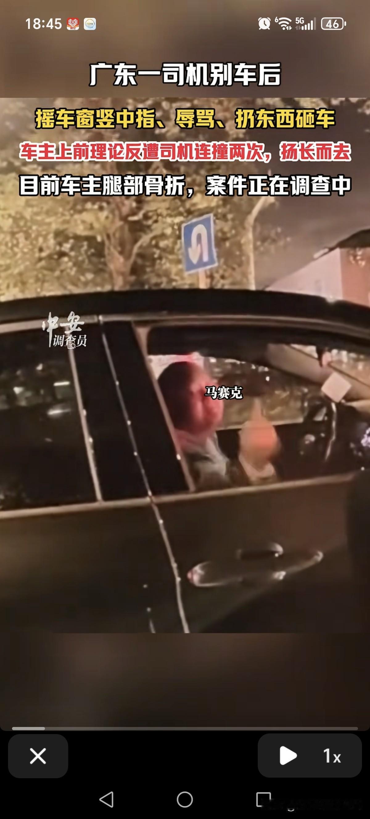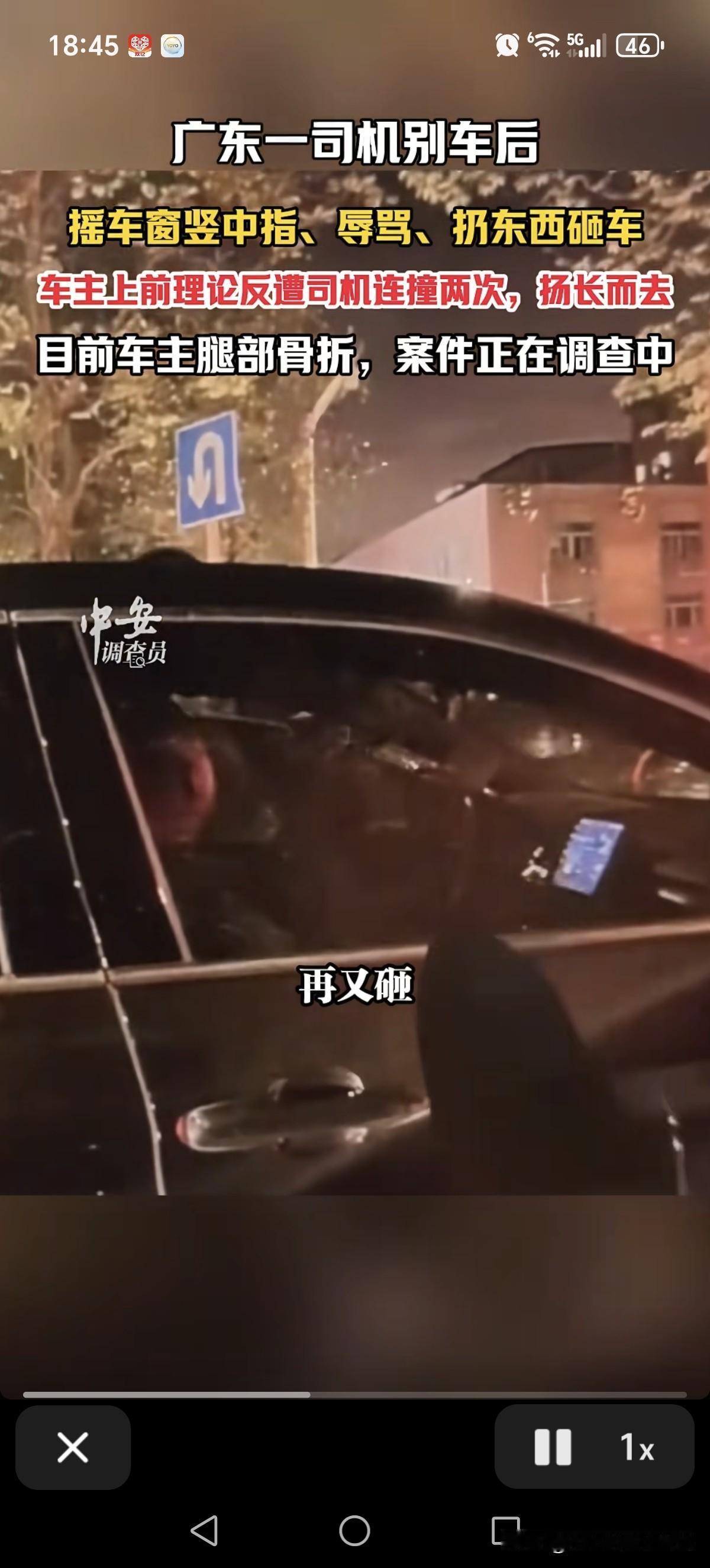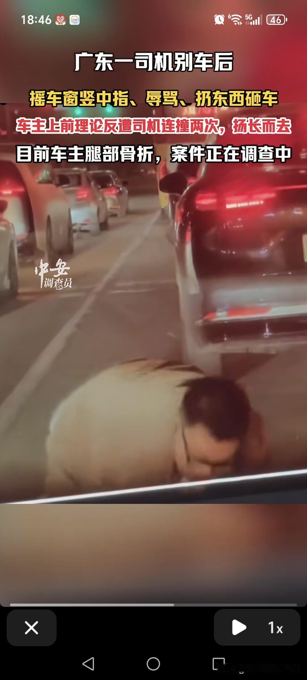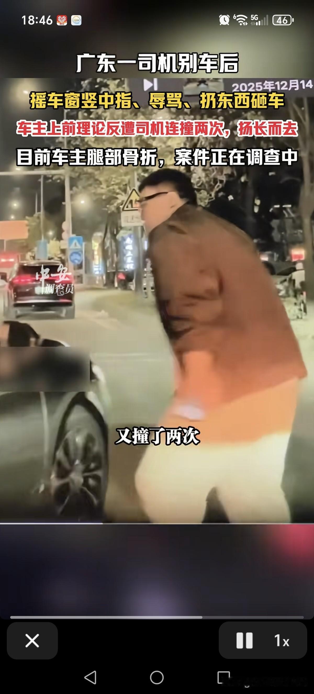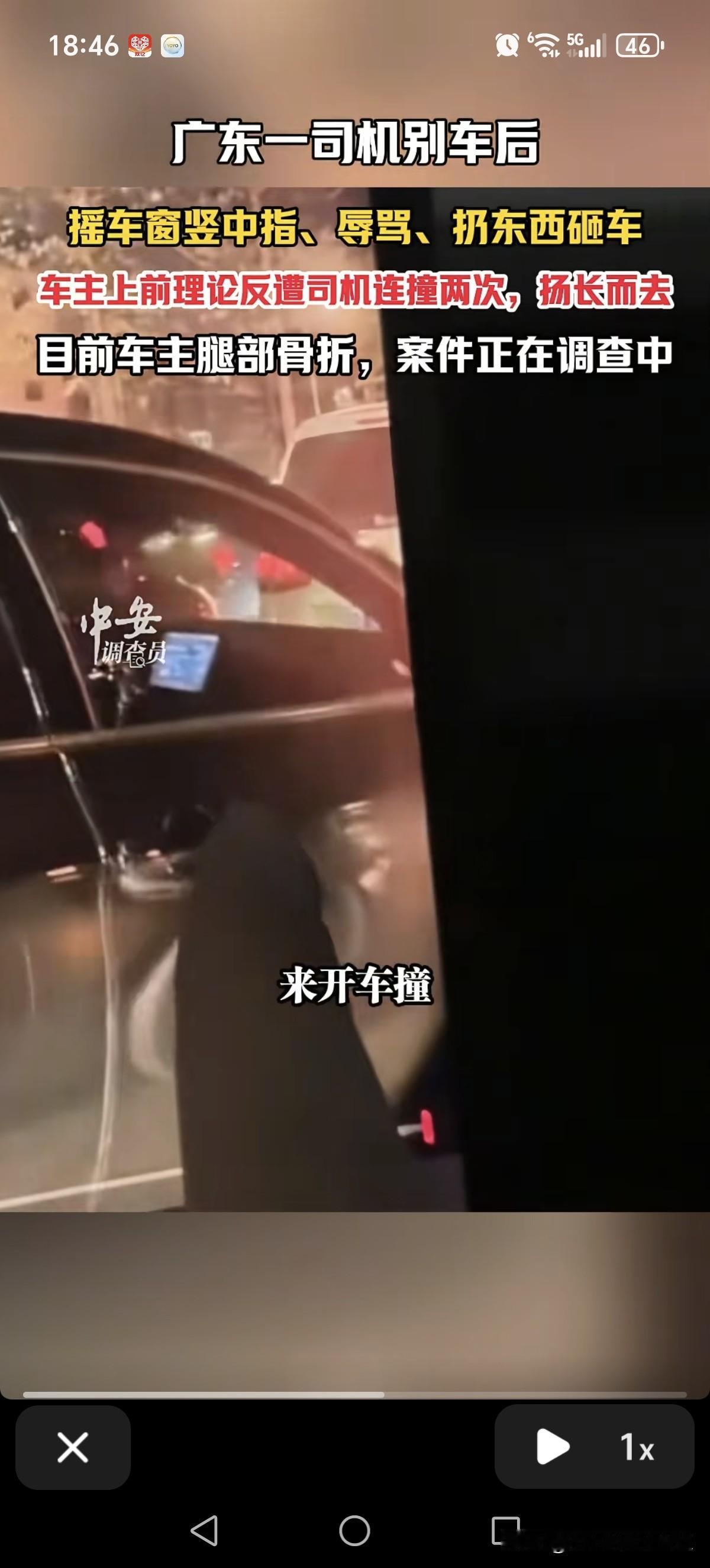 这也太猖狂了吧,广州一司机“路怒症”别车之后,竖中指、砸车、后来还连续2次开车把人撞了,撞成了骨后折肇事逃逸! 广州一个车主在12月14号晚上6点半的时候被别人别车,视频记录着一个光头男开着一辆黑色的小轿车,他直接摇刹了车窗去问号视频车主,在车内的他还竖起了中指,骂了一通之后,还直接往他车里面扔东西! 这是赤裸裸的挑衅,车主气的立刻下车去找他理论,可没想到这个光头男这个时候就不敢下车了,而且也不敢打开车窗玻璃,车主看他这样子也拿他没办法,想着哎,还是算了吧,不跟这样的人计较,可没想到的是他从光头男的车前面想绕过去走回自己车里时,光头男一脚油门直接把车主给撞了,车主接直摔了个跟斗,摔出了1米外。 车主忍着痛,好不容易爬起来,想要找光头男算账,可没想到的是,光头男又趁着这个机会,再加了一脚油门,又把车主给撞了,撞人之后,光头男就肇事逃逸了! 都快2026年了,居然还有人这么嚣张啊!车牌是拍的,清清楚楚啊! 后来这个车主忍痛去了医院,拍了片子,发现自己的脚已经骨裂了。 有网友说,可能是这个车主故意不放出前因后果,但是我想说,光头男踩了油门的行为已经不是交普通的交通事故了吧?这是故意伤害啊,这是危险驾驶罪,至少三年起步,在严重点就是以危险方法危害公共罪。 这个光头男就算有100个理由也没有用了,网友们劝这个车主不要和解,但是目前现在这个视频已经看不见了!后续也不知道怎么样!