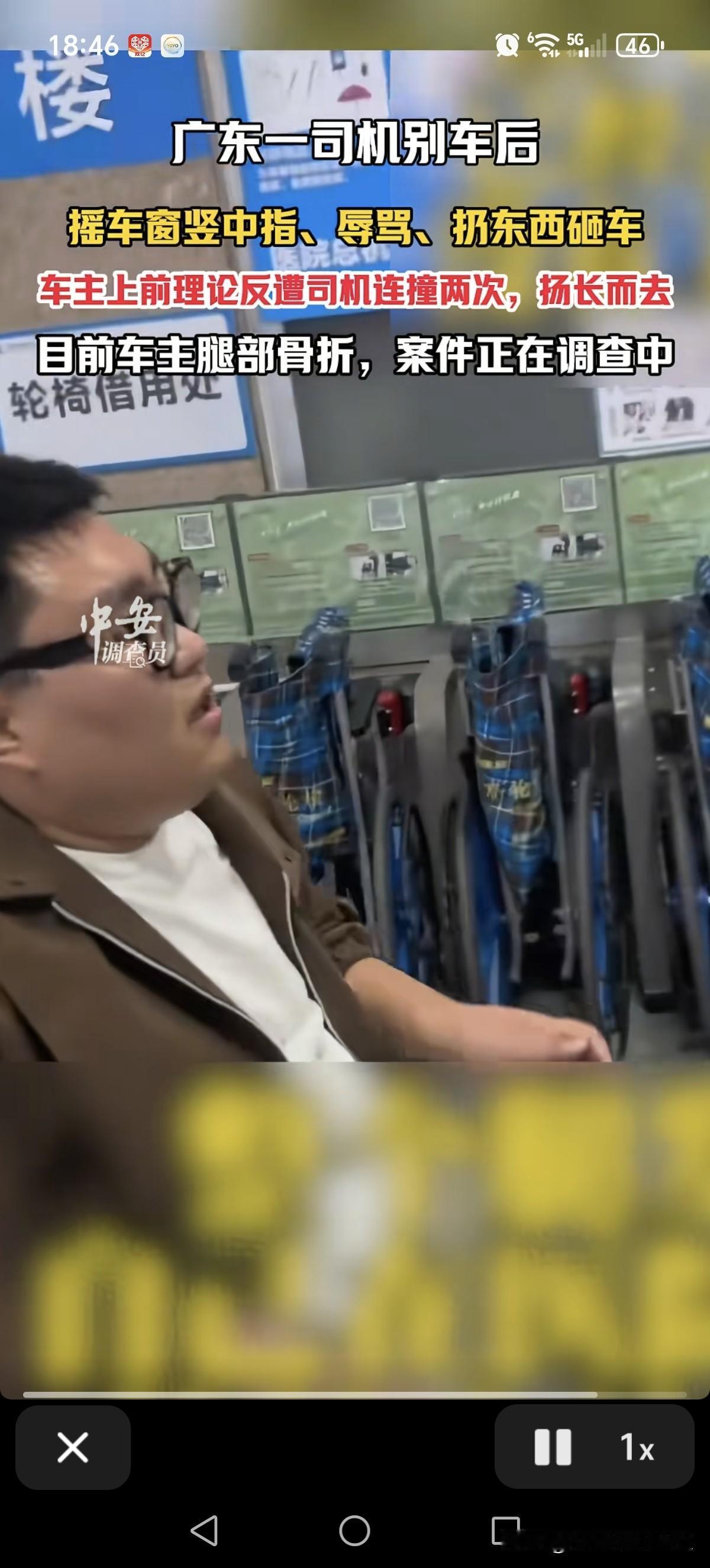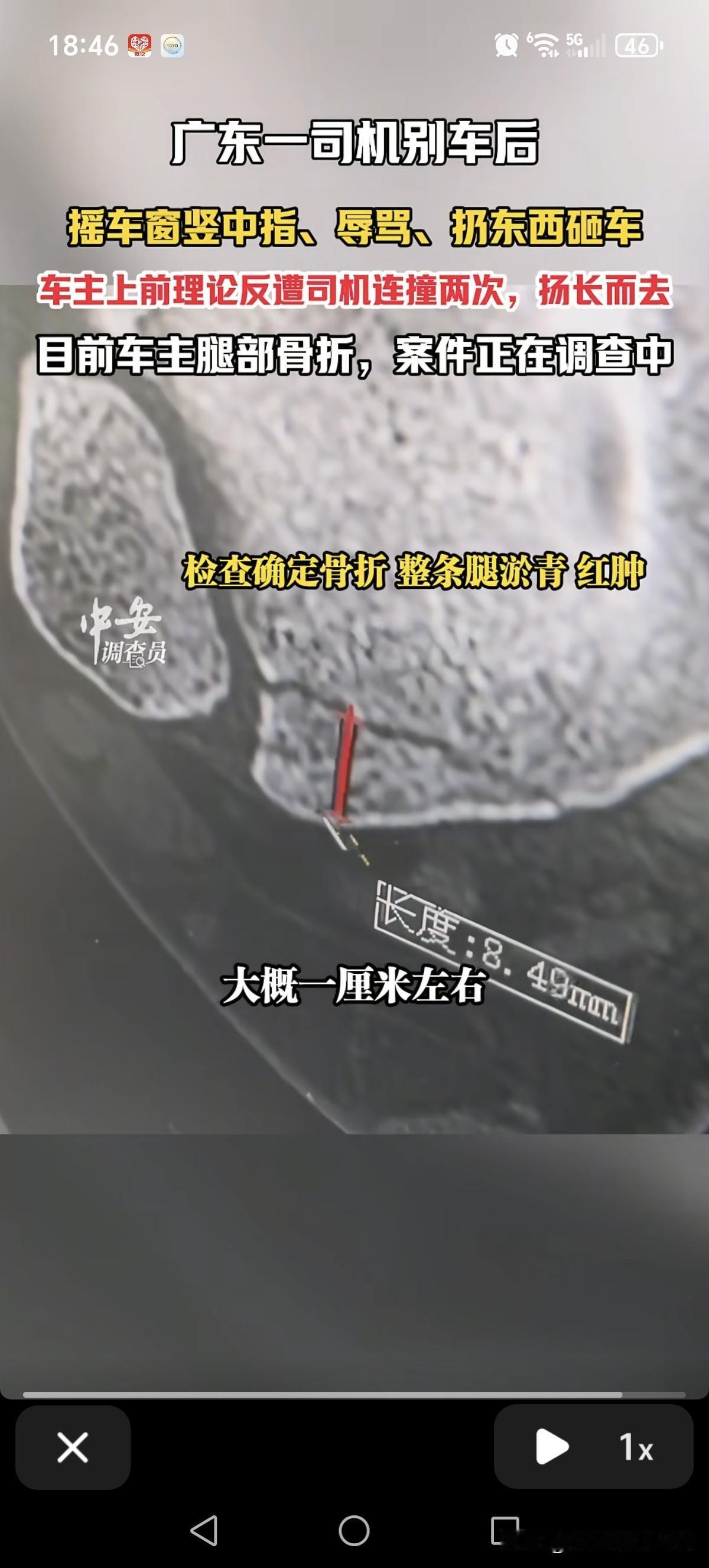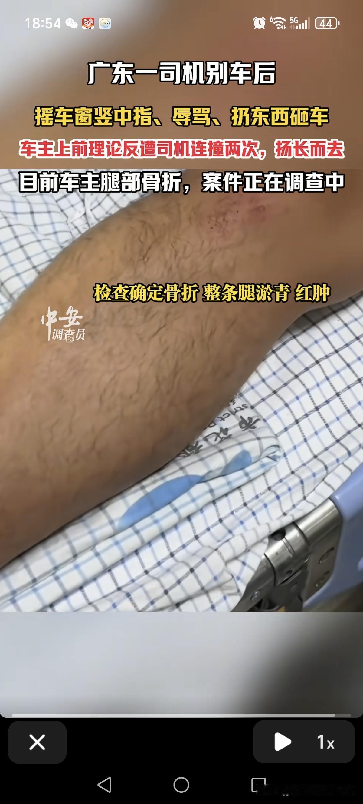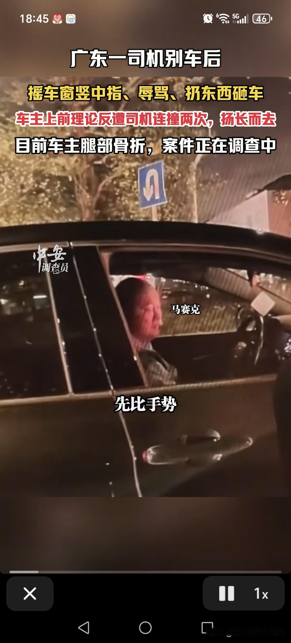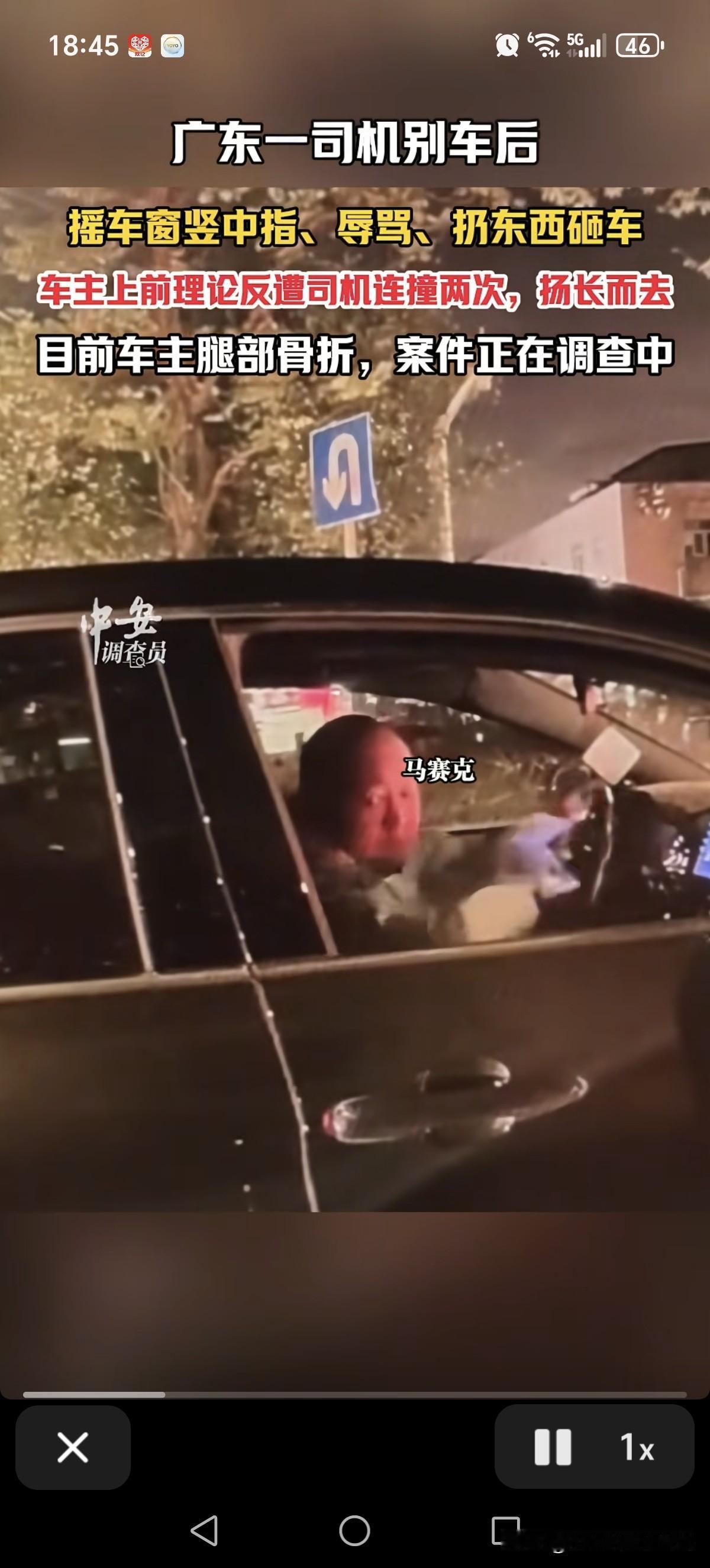这也太猖狂了吧,广州一司机“路怒症”别车之后,竖中指、砸车、后来还连续2次开车把人撞了,撞成了骨后折肇事逃逸! 广州一个车主在12月14号晚上6点半的时候被别人别车,视频记录着一个光头男开着一辆黑色的小轿车,他直接摇刹了车窗去问号视频车主,在车内的他还竖起了中指,骂了一通之后,还直接往他车里面扔东西! 这是赤裸裸的挑衅,车主气的立刻下车去找他理论,可没想到这个光头男这个时候就不敢下车了,而且也不敢打开车窗玻璃,车主看他这样子也拿他没办法,想着哎,还是算了吧,不跟这样的人计较,可没想到的是他从光头男的车前面想绕过去走回自己车里时,光头男一脚油门直接把车主给撞了,车主接直摔了个跟斗,摔出了1米外。 车主忍着痛,好不容易爬起来,想要找光头男算账,可没想到的是,光头男又趁着这个机会,再加了一脚油门,又把车主给撞了,撞人之后,光头男就肇事逃逸了! 都快2026年了,居然还有人这么嚣张啊!车牌是拍的,清清楚楚啊! 后来这个车主忍痛去了医院,拍了片子,发现自己的脚已经骨裂了。 有网友说,可能是这个车主故意不放出前因后果,但是我想说,光头男踩了油门的行为已经不是交普通的交通事故了吧?这是故意伤害啊,这是危险驾驶罪,至少三年起步,在严重点就是以危险方法危害公共罪。 这个光头男就算有100个理由也没有用了,网友们劝这个车主不要和解,但是目前现在这个视频已经看不见了!后续也不知道怎么样!