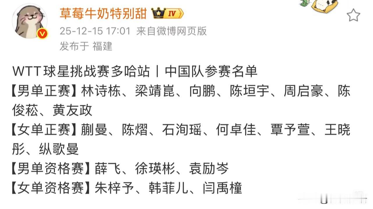 林诗栋、蒯曼都报了多哈球星挑战赛。 国乒小将们要出去开始赚积分了,今天下午看到WTT多哈球星挑战赛的单打名单出来了,国乒参赛的人挺多,男双、女双、混双的名单还没有出来,林诗栋!/蒯曼除了单打,应该也要打混双吧,是得多去历练了。多哈球挑冠军积分是600,多哈冠军赛冠军积分1000,林诗栋、蒯曼、梁靖崑、向鹏、陈熠这两个比赛都参加。 今天中午国乒队员们刚刚回到北京,还没休息就又出来新的赛程了。多哈冠军赛的时间是11月7日至11月11日,多哈球星挑战赛的时间是11月13日至17日,都在一个地方,大家也不用来回跑。看到张本智和也报名参加球星挑战赛了,看了他的采访说要多打比赛赚积分,想要成为世界第一。 今年的WTT总决赛张本智和是拿到了冠军,在半决赛的时候他是4-3赢了林诗栋,如果在球挑再遇上张本智和,希望林诗栋打的时候也能喊出来,不要退台,相信自己能赢。运动员们一直在打比赛,真的是没有时间研究对手,也没时间练新技术,不过张本智和换了教练后,确实涨球了。