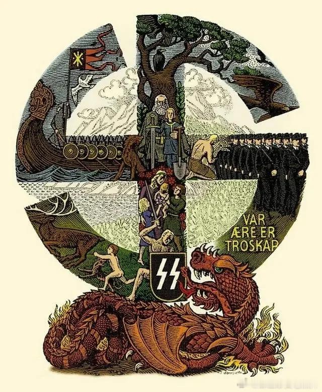 纳粹占领挪威后发布的宣传海报,鼓动挪威人加入党卫军维京师。图中可见维京龙船。