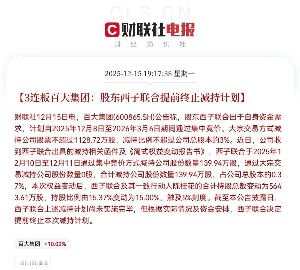 突发利好!3连板百大集团突发利好!预计明日百大集团要继续跳空一字板了,满仓百大集团的股民们明日要继续吃大肉了…晚间7点17分,百大集团发布重磅公告称,公司第二大股东西子联合将提前终止减持计划,未完成减持988.78万股,此消息一出,股民们又讨论开了,股民们认为百大集团终止减持主要是认为公司趁这个势头有望成为跨年妖股,未来有无限高度,怕错过了这波行情,总之虽然终止减持的具体原因不得而知,但是这对于公司股价来说是一个大利好消息,减少了抛压,又给投资者带来了持股信心,这是给连板的百大集团火上浇油啊股民们!坐稳扶好!受此利好消息刺激,预计明日百大集团要继续涨停迎来4连板了,乐观一点起码5连板起步,有望冲击10连板了,恭喜满仓的股民们,可以一直大肉吃不停了!