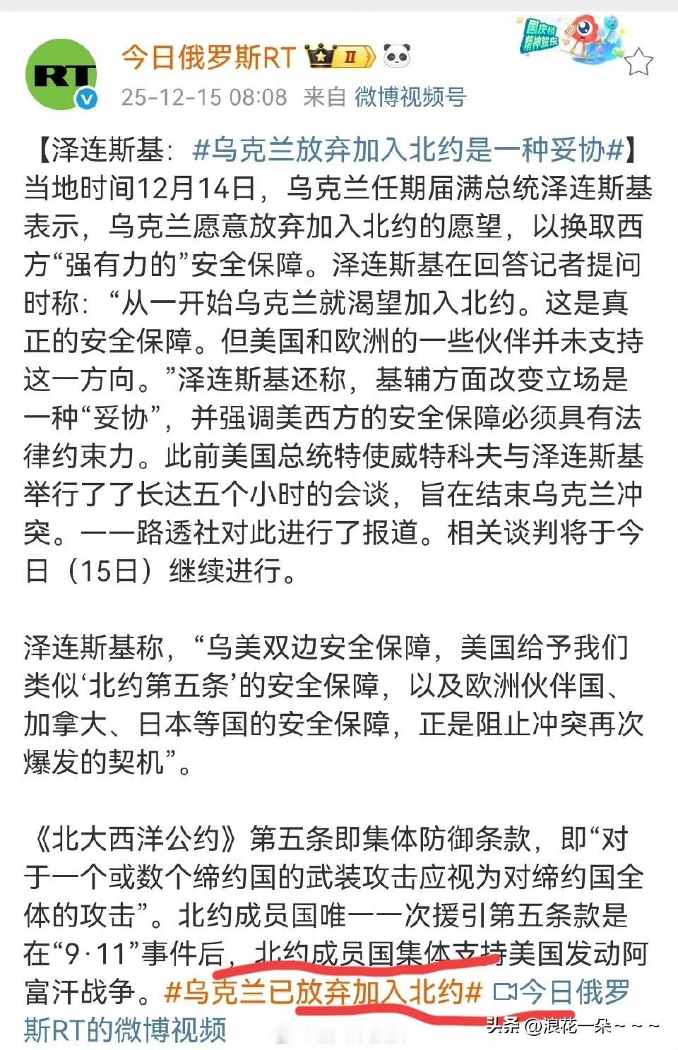 看看吧!泽连斯基可不傻吧?聪明得嘞!就像专家所说:让美国提供类北约第五条的可能性不是很大。老特的想法是给点空中和情报支持意思一下。 如果仔细看看,“北大西洋公约”第5条的话。这和加入北约有多少区别呢?只是换了一种说法而已我感觉的。 当然,这可能是泽连斯基换了一种安全保障吧。美国应该不同意,俄罗斯应该也不答应。不过,这个“擦边球”泽连斯基打的还是不错的。