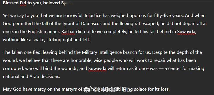 叙利亚南部苏韦达省,亲HTS的一名德鲁兹博主安瓦尔·沙尔被人枪杀。