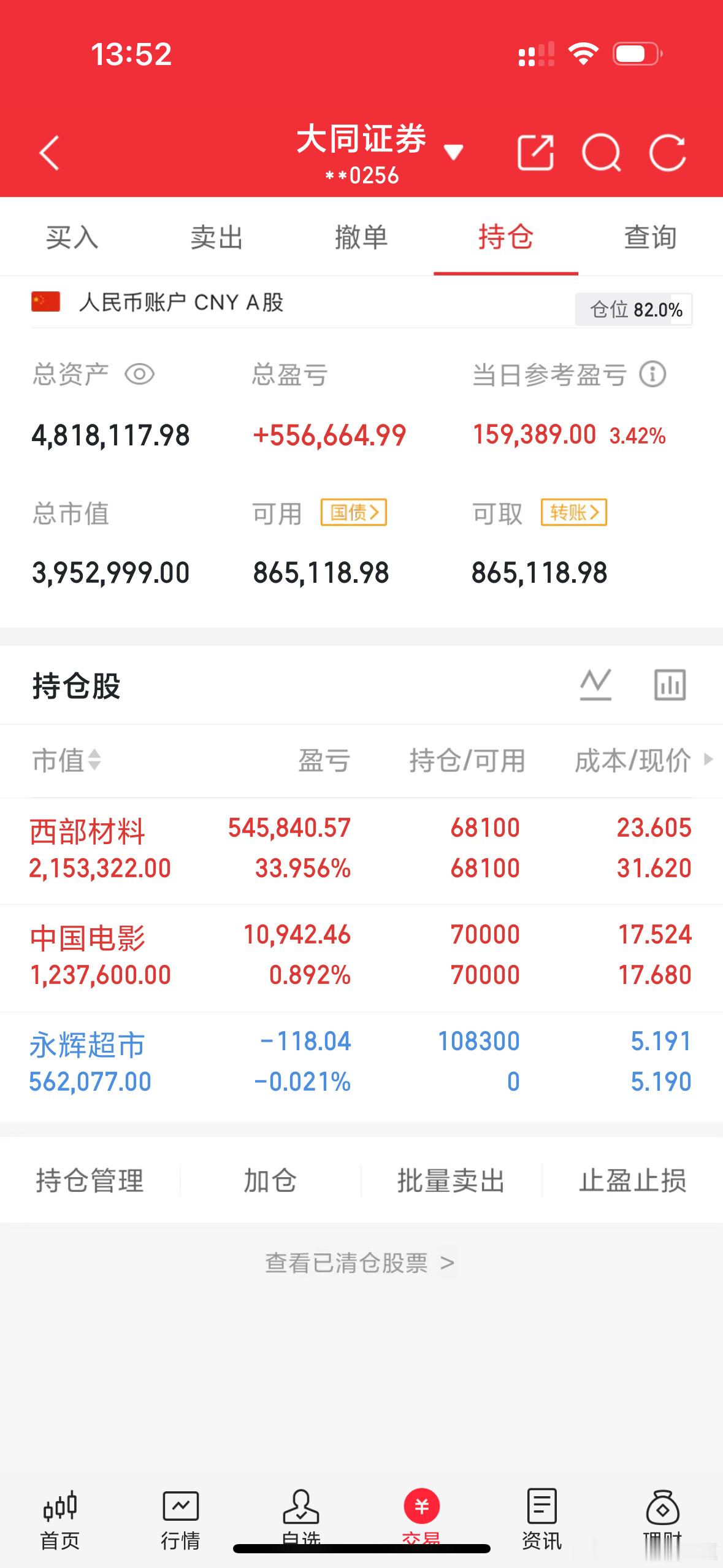 下午建仓永辉超市,继续拿着中国电影跟西部材料,继续看好西部材料,大家认为西部材料今天下午能不能涨停,建仓永辉超市是看好年底商业百货板块,我认为永辉超市能到6块钱以上
