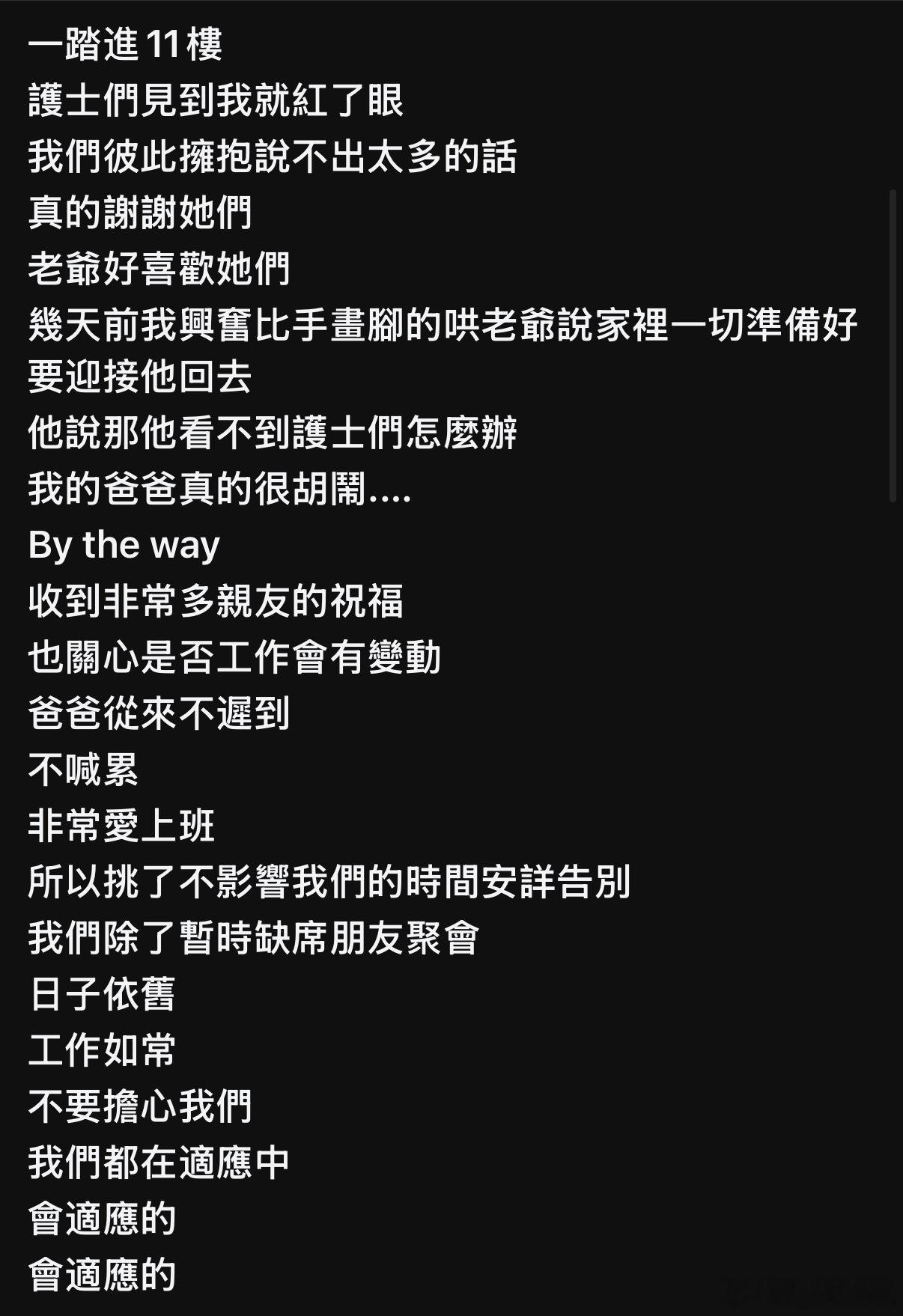 林有慧再发文谈父亲离开的心情,代入一下心里酸酸的。“我们都在适应中,会适应的,会适应的”