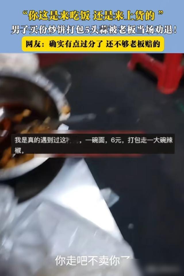 天津,男子去路边摊买了份炒饼,摊主递给他时发现男子在他店里打包了5头大蒜、半袋咸菜和一小碗辣椒油。摊主气笑了,将炒饼从男子手里抢了回来。 ​ 这事儿看着就让人来气。 ​ 一份炒饼才多少钱? ​ 这么打包跟明抢有啥区别。 ​ 路边小本生意不容易。 ​ 强子开的是快餐店,利润薄得很。 ​ 蒜头咸菜辣椒油,都是搭着主食免费提供的。 ​ 让你随便吃,不是让你随便拿。 ​ 五头大蒜加半袋咸菜,成本可能真比炒饼高了。 ​ 摊主抢回炒饼,一点毛病没有。 ​ 有人说,既然摆出来就是让用的。 ​ 这话不对。 ​ 摆出来是让你配着饭当场吃的。 ​ 不是让你装袋拎回家的。 ​ 这是基本常识。 ​ 就像你去吃自助餐,能连锅端走吗? ​ 法律上也站得住脚。 ​ 买卖得讲公平诚信。 ​ 花几块钱买炒饼,顺走人家十几块钱的配料。 ​ 这明显是占便宜没够。 ​ 摊主完全有权不卖。 ​ 真较起真来,多拿的那些算不当得利,得还回去。 ​ 生活中这种爱占小便宜的人真不少。 ​ 快餐店顺纸巾,食堂顺餐具。 ​ 总觉得拿点没啥。 ​ 可小本生意经不起这么耗。 ​ 今天你拿五头蒜,明天他拿半瓶醋。 ​ 摊主还活不活了? ​ 将心比心吧。 ​ 谁挣钱都不容易。 ​ 多点体谅,少点算计。 ​ 吃饭就好好吃饭,别总想着“进货”。 ​ 人穷不怕,心不能穷。 ​ 格局大点,路才走得宽。 ​ 这件事说到底是个素质问题。 ​ 老话说,吃亏是福。 ​ 总想占便宜的人,最后往往吃大亏。 ​ 诚信厚道才是长久之计。 ​ 大家都守规矩,生意才好做,社会才和谐。 ​ MCN双量进阶计划