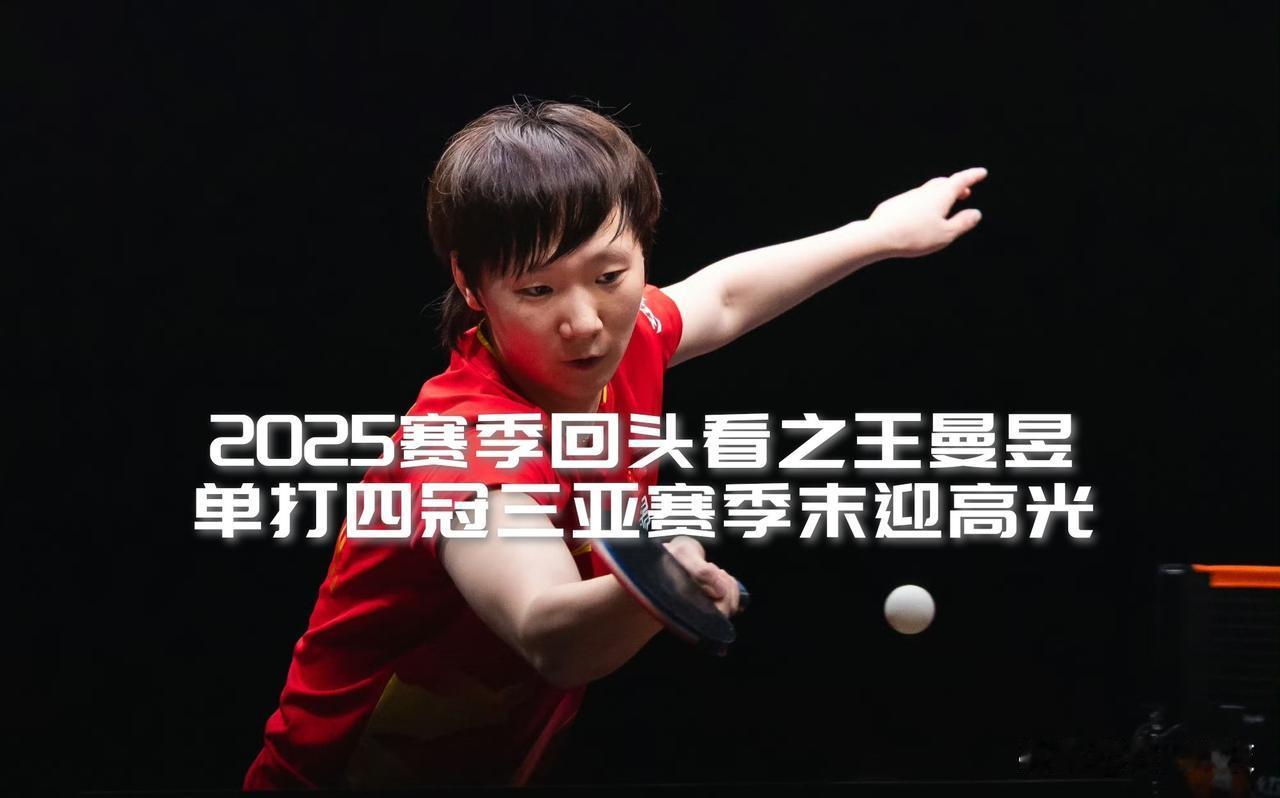 【2025赛季回头看之王曼昱!单打七进决赛四冠三亚赛季末迎来高光!】 王曼昱本赛季战绩分两段,跟孙颖莎参赛次数相同,前半段战绩被孙颖莎彻底拉开,后半段战绩持续高光,超越孙颖莎。 王曼昱本赛季首座女单冠军是亚洲杯,击败孙颖莎夺冠,这是她上半赛季唯一一次夺冠,世锦赛女单决赛输给孙颖莎斩获亚军。 下半赛季,从欧洲大满贯斩获女单亚军开始,一路狂飙,澳门冠军赛又是亚军,中国大满贯、全运会和年终总决赛连续夺冠。 王曼昱本赛季总体战绩仅次于孙颖莎,下半年战绩甚至比孙颖莎还要好!
