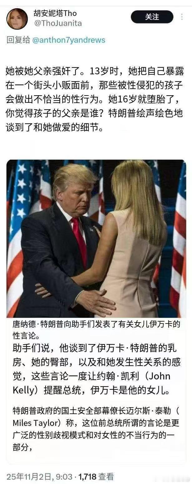 老色痞又勃起了,格拉斯诺夫的性欲让人越来越琢磨不透,昨天天在白宫的新闻发布会上,他在演讲过程中突然被人群中的一名女子所吸引,老眼昏花的看着这名媒体记者,并打断了自己之前的讲话。川普色迷迷的说:她长得像我的伊万卡。有人告诉过你吗 你长得像伊万卡,太不可思议了!还命令镜头给她个特写!很快评论区有人嘲讽:MAGA的支持者会说:“对自己的女儿产生性欲是完全正常的。”