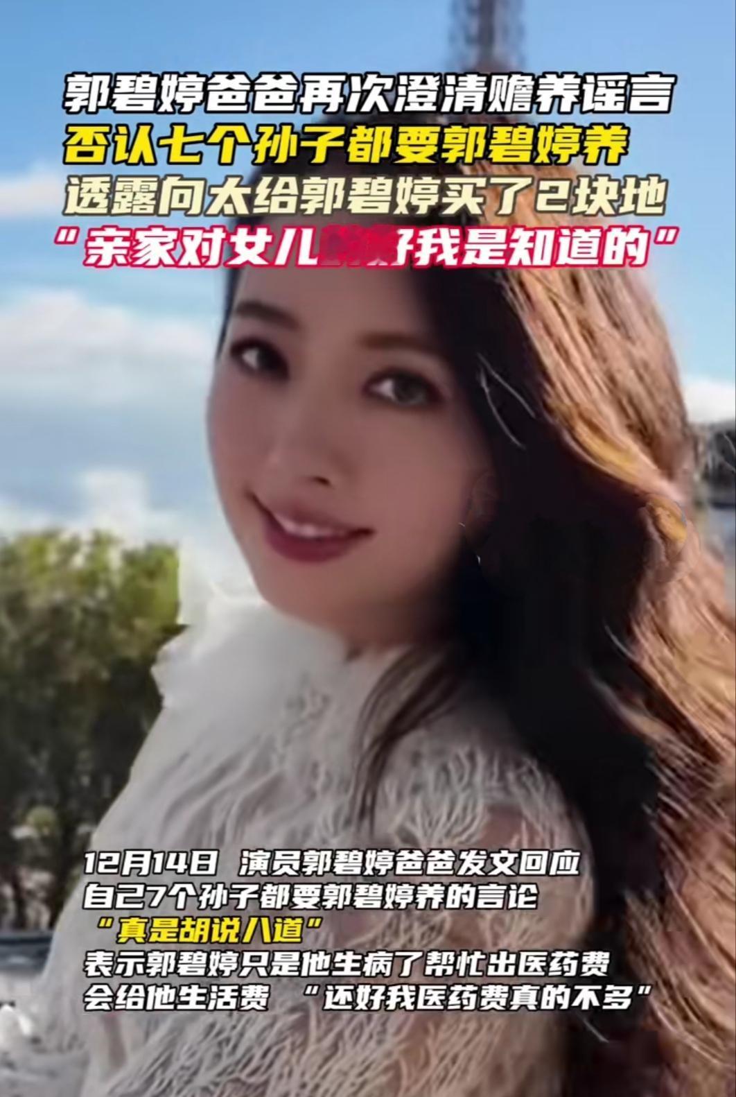 郭碧婷爸爸亲自下场辟谣,一句“七个孙子都要碧婷养真是胡说八道”,直接击碎了传了许久的谣言。还坦言女儿只是帮自己出了不多的医药费,婆家对女儿的好,他都看在眼里记在心里。 作为父亲,他不愿女儿被无端揣测,更不想外界用恶意解读女儿的婚姻。这份维护,无关豪门与财富,只是一个父亲对女儿最本能的守护,简单又真挚,让人瞬间共情。 其实我们总爱给豪门婚姻贴标签,用利益去衡量感情,却忘了婚姻的本质是人与人的相处。郭爸爸的澄清不仅打破了谣言,更让我们看到:真心从不会被财富定义,亲情也从不是流言能撼动的。