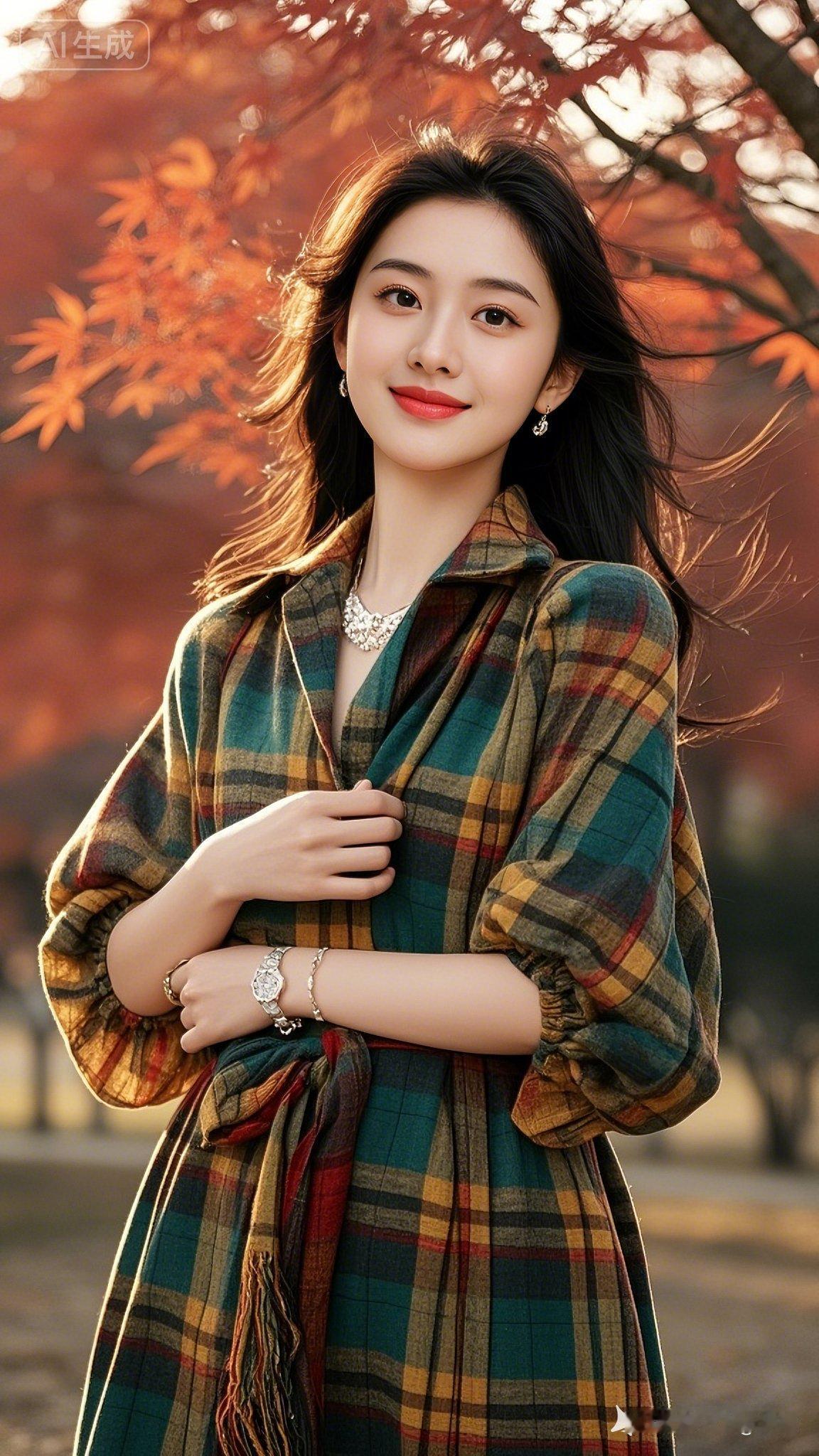 秋日暖阳下的温柔时光,红叶与她相映成趣。