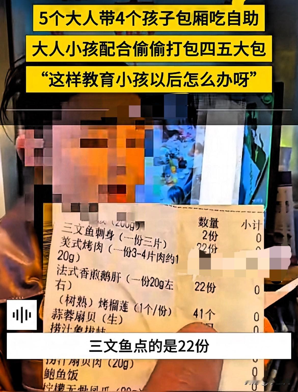 太丢人了!乌鲁木齐,5个大人带着4个孩子,在包厢吃自助。然而吃完后居然偷偷往羽绒服里装,大人孩子一起动手,装了四五包。老板得知后选择曝光视频,网友:“不以为耻,这个不是打包,这叫偷!” 说实话,最让人寒心的不是“占便宜”,而是孩子就在旁边,全程看着、学着、照着做。 有些人会说:“不就几口吃的嘛,至于吗?”可问题是,孩子记住的不是几块肉,而是规则是可以钻的,便宜是可以占的,只要不被发现就行。 吃自助打包,省的是钱,丢的是教育。今天你教他在自助餐里打包,明天他就会觉得:排队可以插队,规则可以变通,诚信不值钱。 真正的教育,不是嘴上说“要做个好孩子”,而是你在生活细节里,怎么做人。钱不多不可怕,怕的是把小聪明,当成生存本事教给孩子。 对于打包自助餐这件事,大家如何看呢? (信息来源:新浪新闻)
