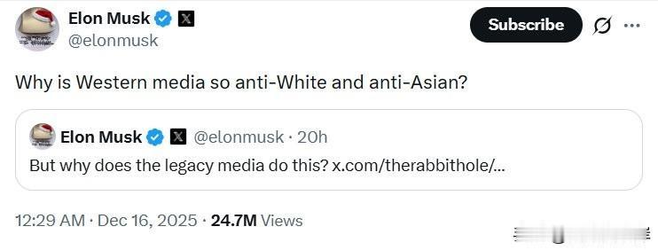 马斯克发出历史一问。 “为什么西方媒体如此反白人和反亚裔?”