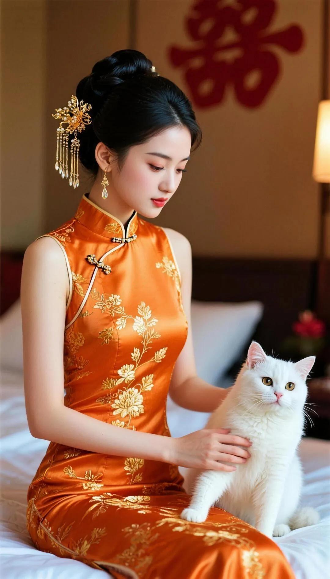 东方美人与猫咪的优雅时光